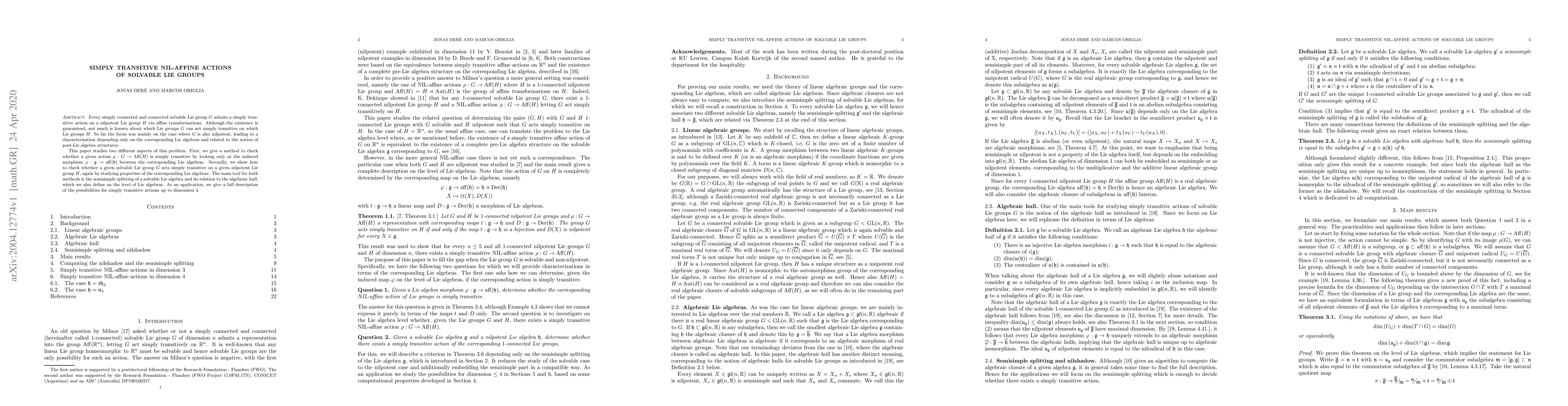 This paper investigates solvable Lie groups' simply transitive affine actions on nilpotent Lie groups, proposing methods to determine transitivity via the induced Lie algebra morphisms. It uses semisimple splitting and introduces the algebraic hull on the Lie algebra level, providing a detailed analysis up to dimension 4.
