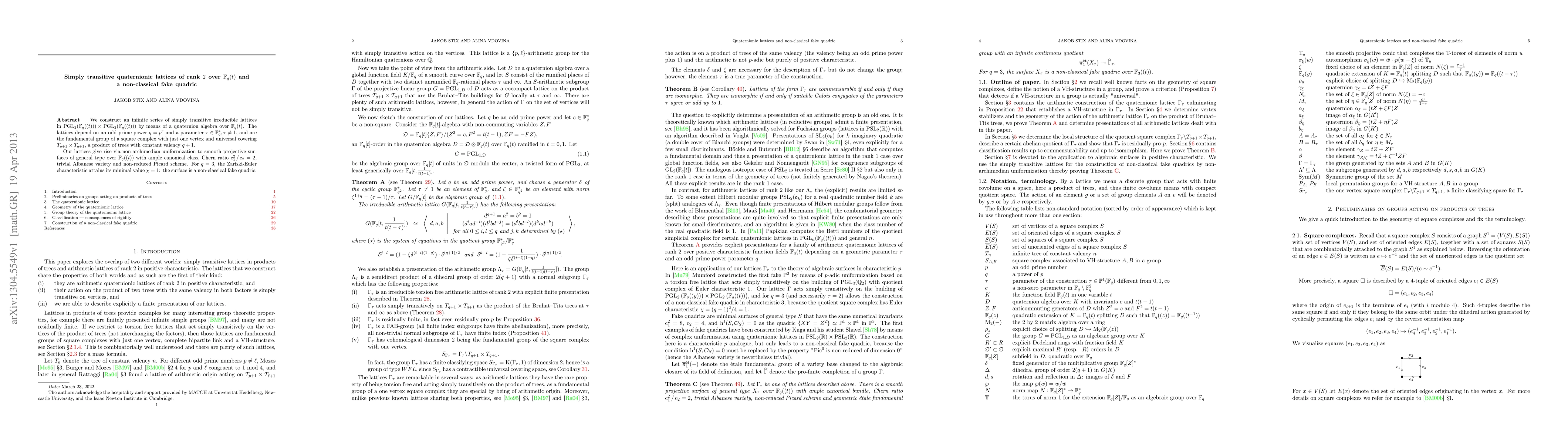 This paper constructs an infinite series of simply transitive lattices in PGL_2(F_q((t))) × PGL_2(F_q((t))) using quaternion algebras over F_q(t). These lattices lead to smooth projective surfaces of general type with unique properties, including a non-classical fake quadric for q = 3.