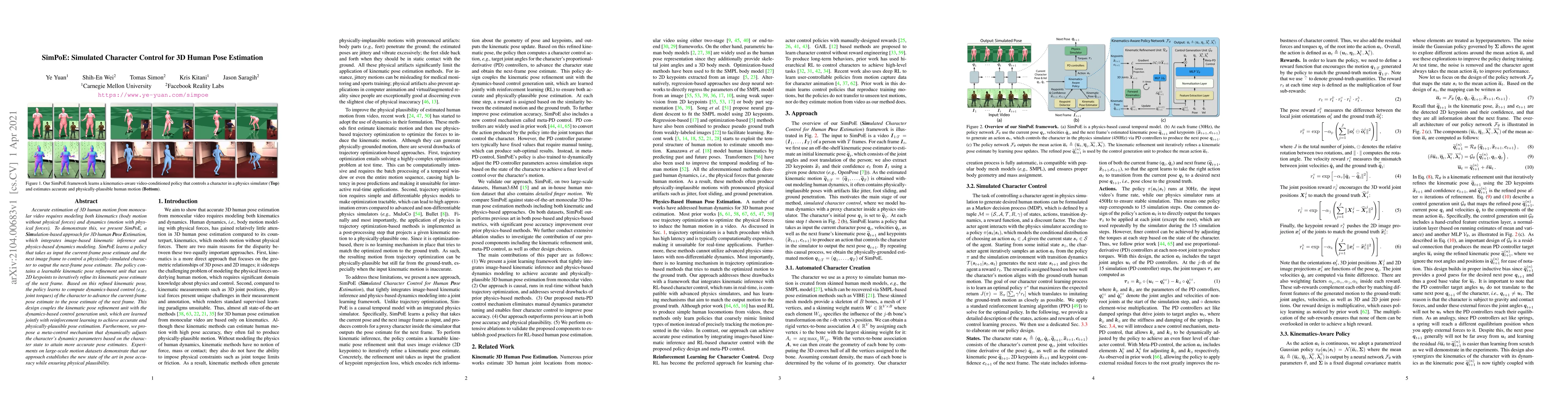 SimPoE introduces a simulation-based approach for 3D human pose estimation by integrating kinematic inference with physics-based dynamics modeling, achieving state-of-the-art accuracy through reinforcement learning and a meta-control mechanism for dynamic parameter adjustment.