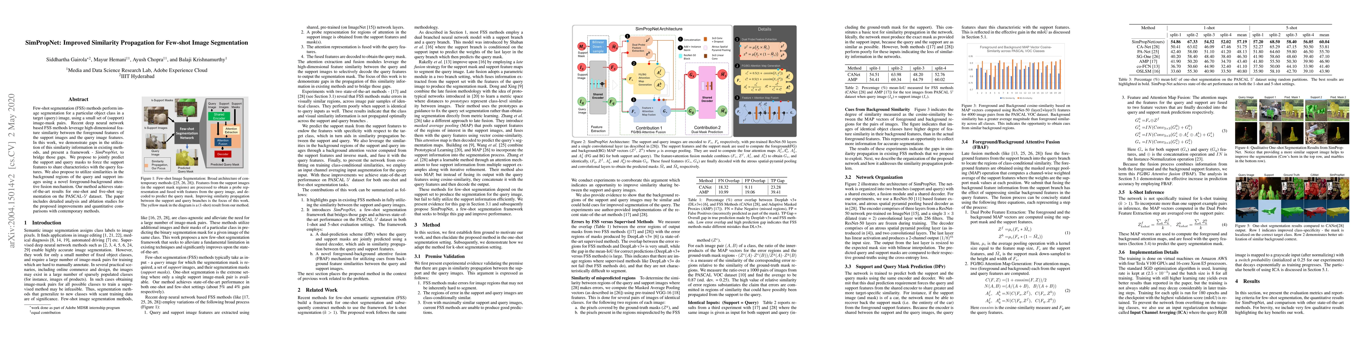 Few-shot segmentation (FSS) methods perform image segmentation for a particular object class in a target (query) image, using a small set of (support) image-mask pairs. Recent deep neural network based FSS methods leverage high-dimensional feature similarity between the foreground features of the support images and the query image features. In this work, we demonstrate gaps in the utilization of this similarity information in existing methods, and present a framework - SimPropNet, to bridge those gaps. We propose to jointly predict the support and query masks to force the support features to share characteristics with the query features. We also propose to utilize similarities in the background regions of the query and support images using a novel foreground-background attentive fusion mechanism. Our method achieves state-of-the-art results for one-shot and five-shot segmentation on the PASCAL-5i dataset. The paper includes detailed analysis and ablation studies for the proposed improvements and quantitative comparisons with contemporary methods.