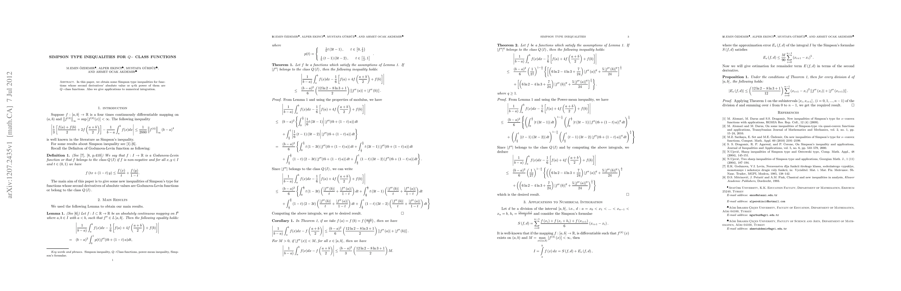 This paper establishes Simpson type inequalities for functions where the second derivative's absolute value or its q-th power is a Q-class function, and demonstrates applications to numerical integration techniques.