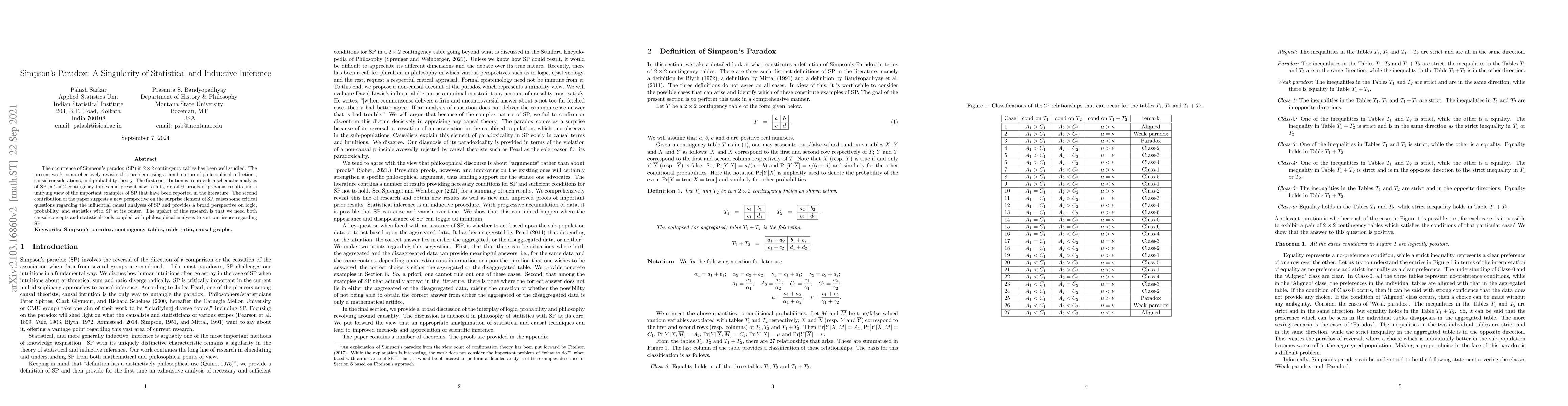 The occurrence of Simpson's paradox (SP) in $2\times 2$ contingency tables has been well studied. The present work comprehensively revisits this problem using a combination of philosophical reflections, causal considerations, and probability theory. The first contribution is to provide a schematic analysis of SP in $2\times 2$ contingency tables and present new results, detailed proofs of previous results and a unifying view of the important examples of SP that have been reported in the literature. The second contribution of the paper suggests a new perspective on the surprise element of SP, raises some critical questions regarding the influential causal analyses of SP and provides a broad perspective on logic, probability, and statistics with SP at its center. The upshot of this research is that we need both causal concepts and statistical tools coupled with philosophical analyses to sort out issues regarding SP.