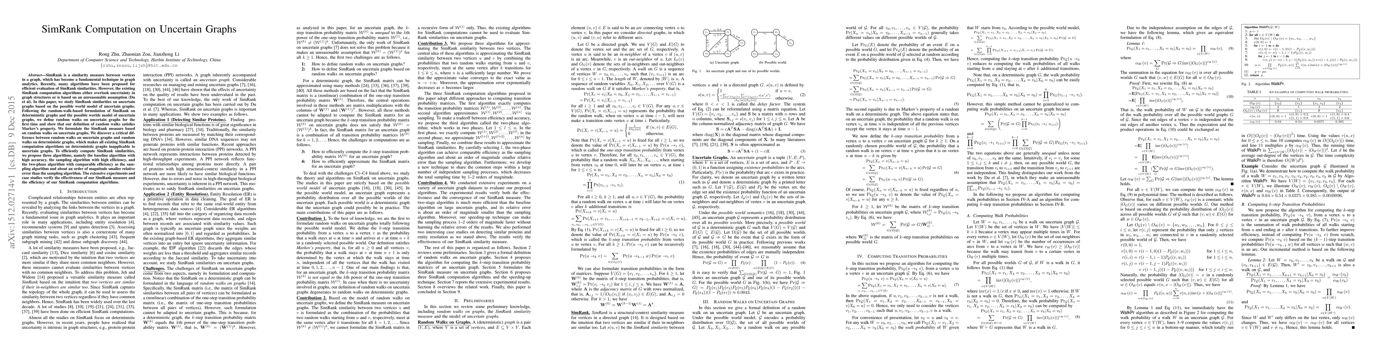 This paper proposes a method to compute SimRank on uncertain graphs using a possible world model and random walks, highlighting a critical difference from deterministic graphs. It introduces three algorithms: a high-accuracy baseline, a highly efficient sampling algorithm, and a two-phase algorithm balancing efficiency and accuracy, with experiments verifying their effectiveness.