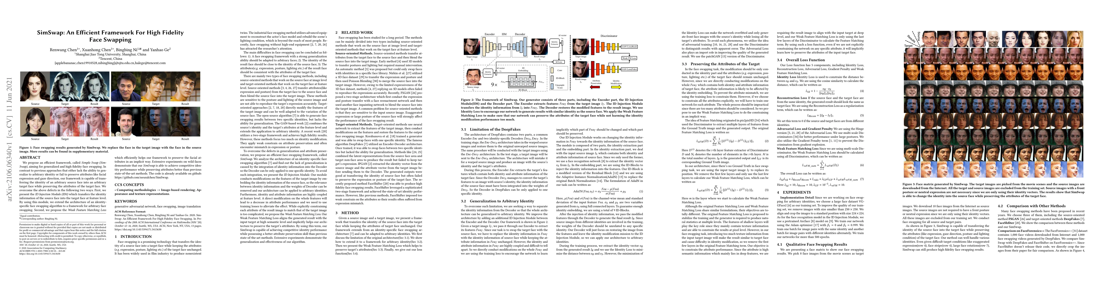 The research introduces SimSwap, an efficient framework for high-fidelity face swapping, which includes the ID Injection Module (IIM) for transferring identity information at the feature level and the Weak Feature Matching Loss for attribute preservation.