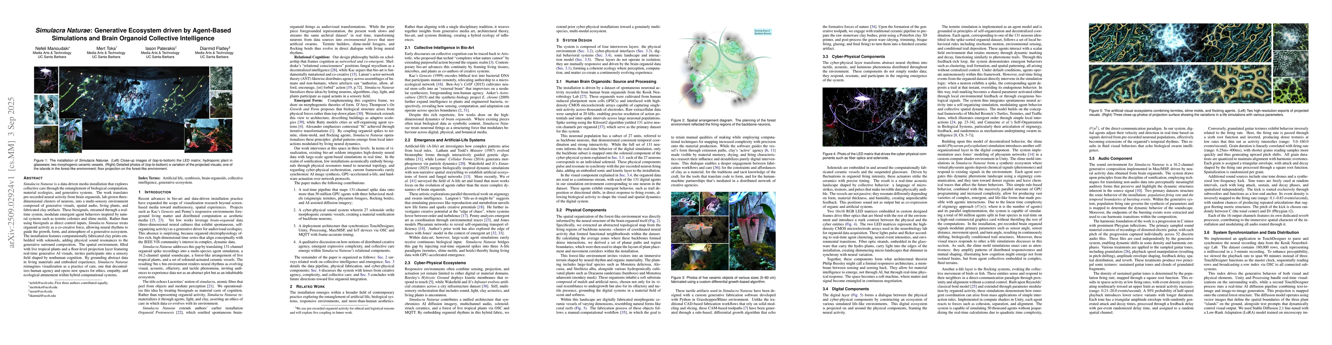 Simulacra Naturae is a data-driven media installation that explores collective care through the entanglement of biological computation, material ecologies, and generative systems. The work translates pre-recorded neural activity from brain organoids, lab-grown three-dimensional clusters of neurons, into a multi-sensory environment composed of generative visuals, spatial audio, living plants, and fabricated clay artifacts. These biosignals, streamed through a real-time system, modulate emergent agent behaviors inspired by natural systems such as termite colonies and slime molds. Rather than using biosignals as direct control inputs, Simulacra Naturae treats organoid activity as a co-creative force, allowing neural rhythms to guide the growth, form, and atmosphere of a generative ecosystem. The installation features computationally fabricated clay prints embedded with solenoids, adding physical sound resonances to the generative surround composition. The spatial environment, filled with live tropical plants and a floor-level projection layer featuring real-time generative AI visuals, invites participants into a sensory field shaped by nonhuman cognition. By grounding abstract data in living materials and embodied experience, Simulacra Naturae reimagines visualization as a practice of care, one that decentralizes human agency and opens new spaces for ethics, empathy, and ecological attunement within hybrid computational systems.