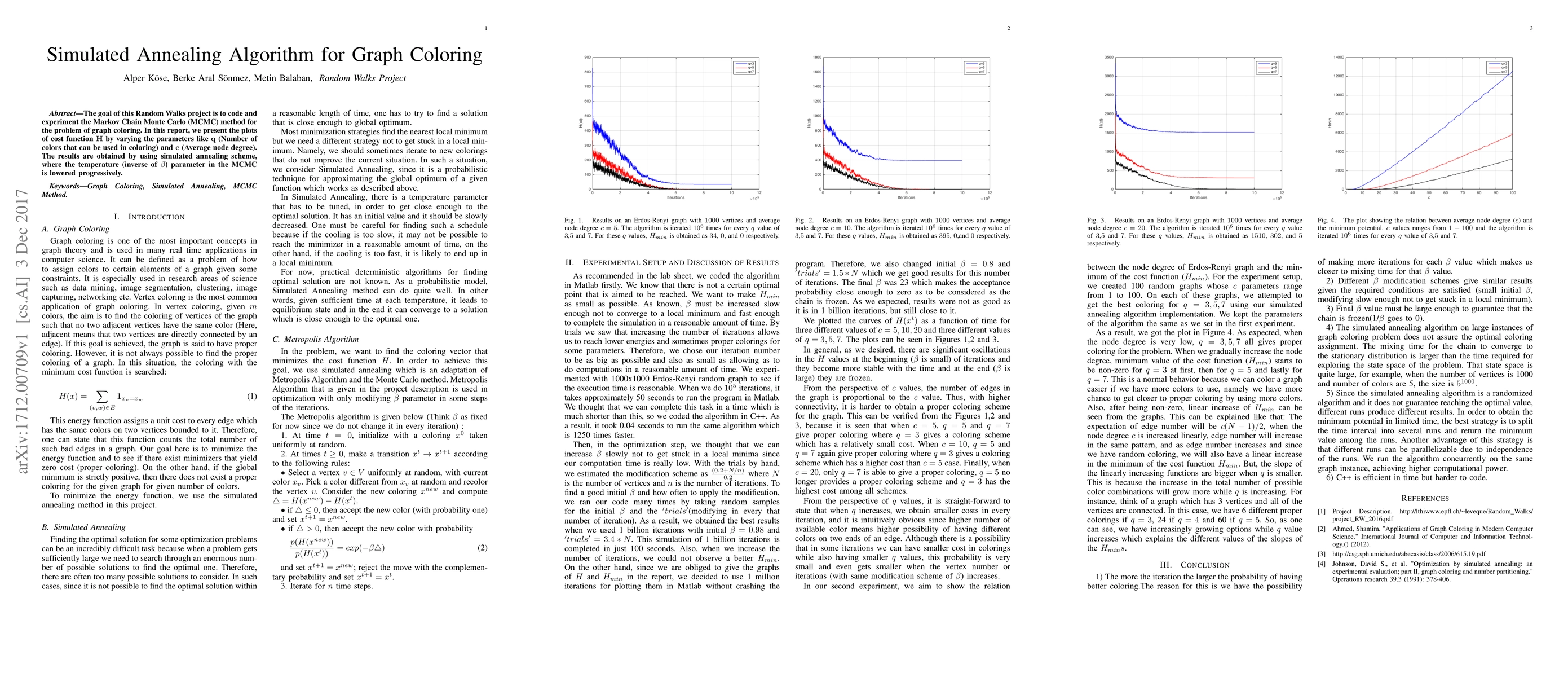 The goal of this Random Walks project is to code and experiment the Markov Chain Monte Carlo (MCMC) method for the problem of graph coloring. In this report, we present the plots of cost function \(\mathbf{H}\) by varying the parameters like \(\mathbf{q}\) (Number of colors that can be used in coloring) and \(\mathbf{c}\) (Average node degree). The results are obtained by using simulated annealing scheme, where the temperature (inverse of \(\mathbf{\beta}\)) parameter in the MCMC is lowered progressively.