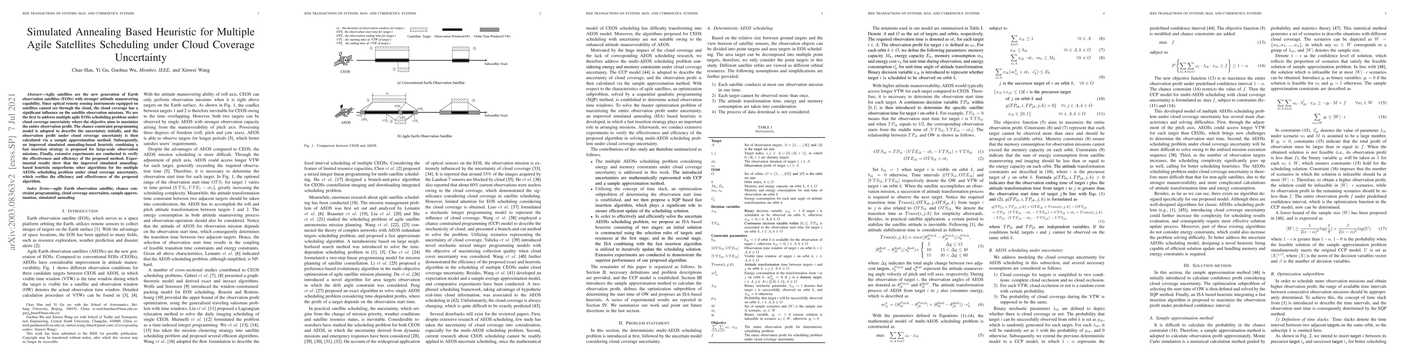 This paper proposes an improved simulated annealing heuristic for scheduling multiple agile Earth observation satellites under cloud coverage uncertainty to maximize observation profit. The method combines a fast insertion strategy and outperforms other algorithms, demonstrating its efficiency and effectiveness.