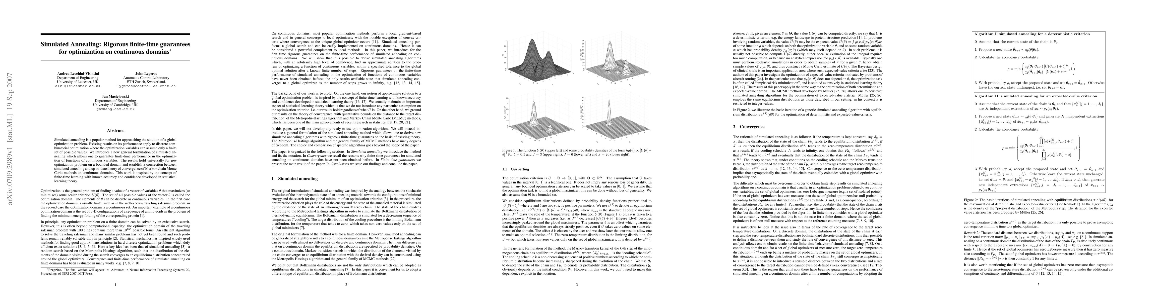 This paper introduces a novel formulation of simulated annealing that provides rigorous finite-time performance guarantees for continuous optimization problems. It establishes a connection between simulated annealing and the convergence theory of Markov chain Monte Carlo methods, extending the method's applicability to continuous domains.
