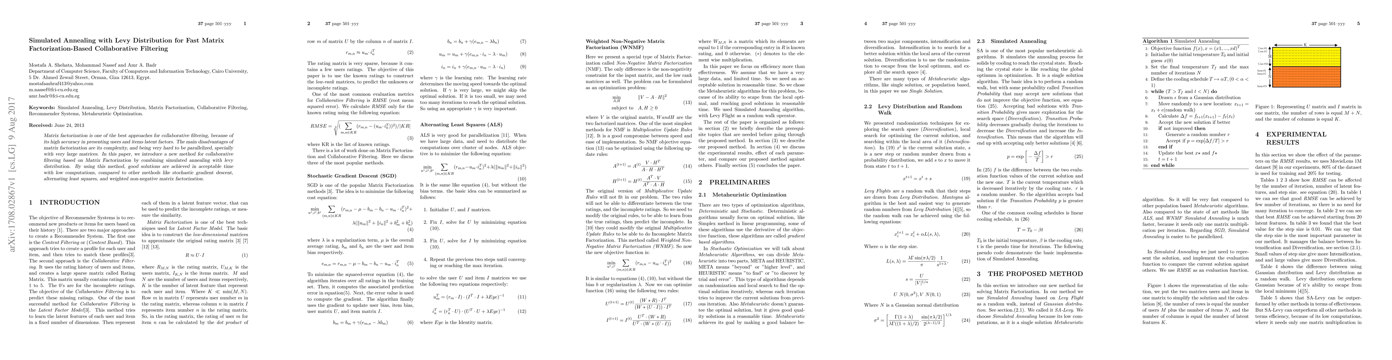 This paper proposes a new method for collaborative filtering that combines simulated annealing with Levy distribution for faster matrix factorization, achieving good results in shorter time and with lower computational effort compared to traditional methods like stochastic gradient descent and alternating least squares.