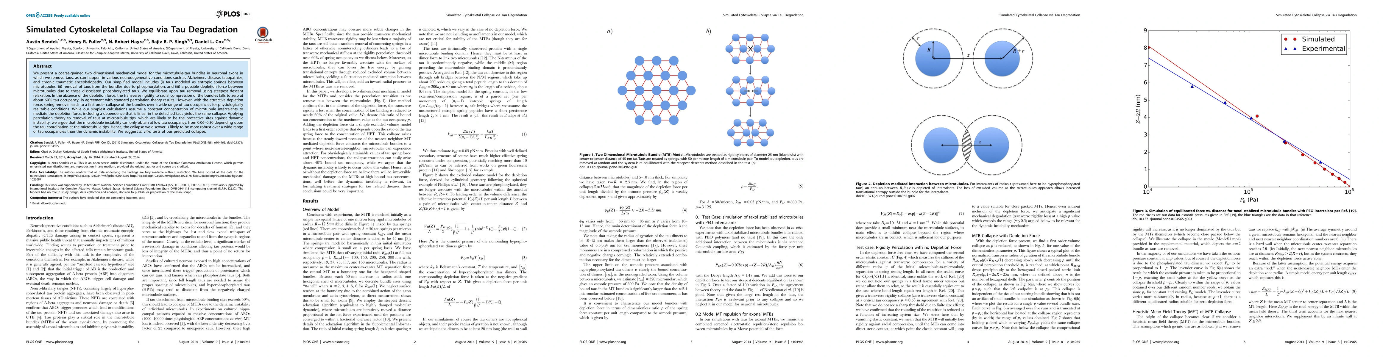 We present a coarse-grained two dimensional mechanical model for the microtubule-tau bundles in neuronal axons in which we remove taus, as can happen in various neurodegenerative conditions such as Alzheimer's disease, tauopathies, and chronic traumatic encephalopathy. Our simplified model includes (i) taus modeled as entropic springs between microtubules, (ii) removal of taus from the bundles due to phosphorylation, and (iii) a possible depletion force between microtubules due to these dissociated phosphorylated taus. We equilibrate upon tau removal using steepest descent relaxation. In the absence of the depletion force, the transverse rigidity to radial compression of the bundle falls to zero at about 60% tau occupancy, in agreement with standard percolation theory results. However, with the attractive depletion force, spring removal leads to a first order collapse of the bundles over a wide range of tau occupancies for physiologically realizable conditions. While our simplest calculations assume a constant concentration of microtubule intercalants to mediate the depletion force, including a dependence that is linear in the detached taus yields the same collapse. Applying percolation theory to removal of taus at microtubule tips, which are likely to be the protective sites against dynamic instability, we argue that the microtubule instability can only obtain at low tau occupancy, from 0.06-0.30 depending upon the tau coordination at the microtubule tips. Hence, the collapse we discover is likely to be more robust over a wide range of tau occupancies than the dynamic instability. We suggest in vitro tests of our predicted collapse.