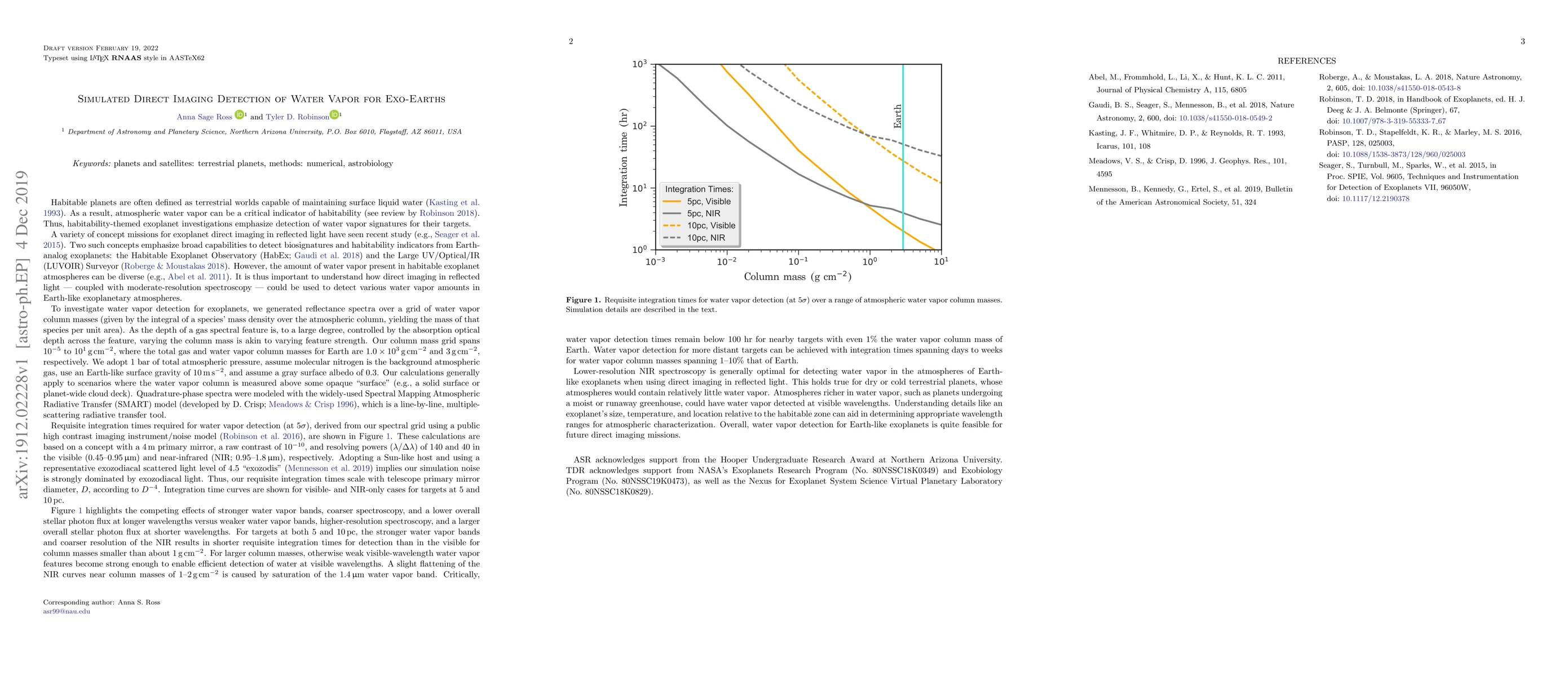 This paper explores the feasibility of detecting water vapor in Earth-like exoplanet atmospheres using direct imaging in reflected light and moderate-resolution spectroscopy. Lower-resolution near-infrared spectroscopy is optimal for detecting water vapor, especially in dry or cold planets, while visible wavelengths are better for planets with abundant water vapor.