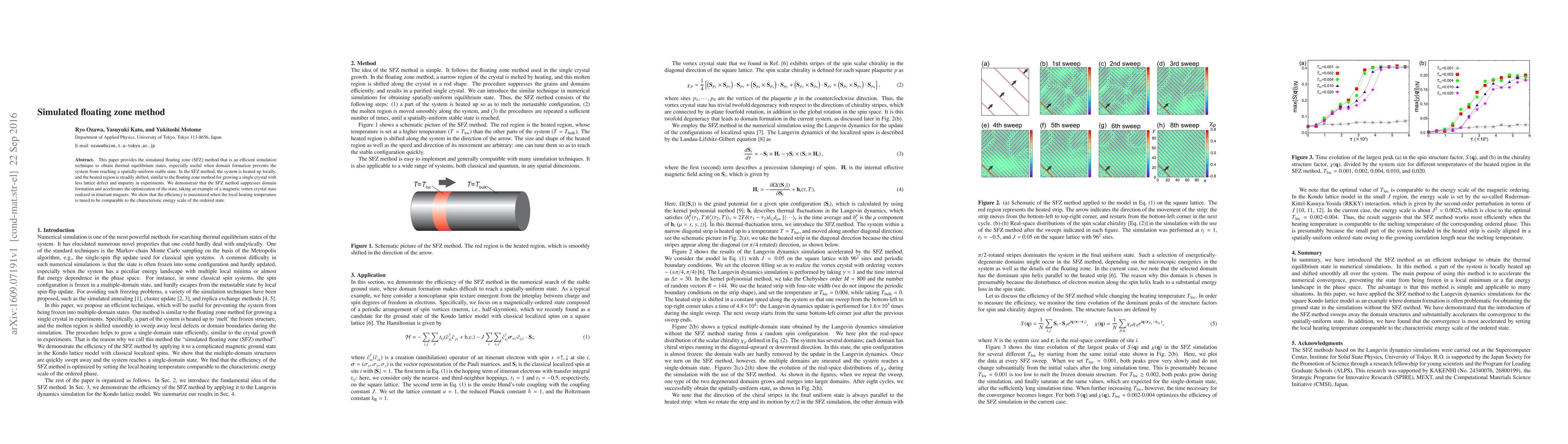 This paper provides the simulated floating zone (SFZ) method that is an efficient simulation technique to obtain thermal equilibrium states, especially useful when domain formation prevents the system from reaching a spatially-uniform stable state. In the SFZ method, the system is heated up locally, and the heated region is steadily shifted, similar to the floating zone method for growing a single crystal with less lattice defect and impurity in experiments. We demonstrate that the SFZ method suppresses domain formation and accelerates the optimization of the state, taking an example of a magnetic vortex crystal state realized in itinerant magnets. We show that the efficiency is maximized when the local heating temperature is tuned to be comparable to the characteristic energy scale of the ordered state.
