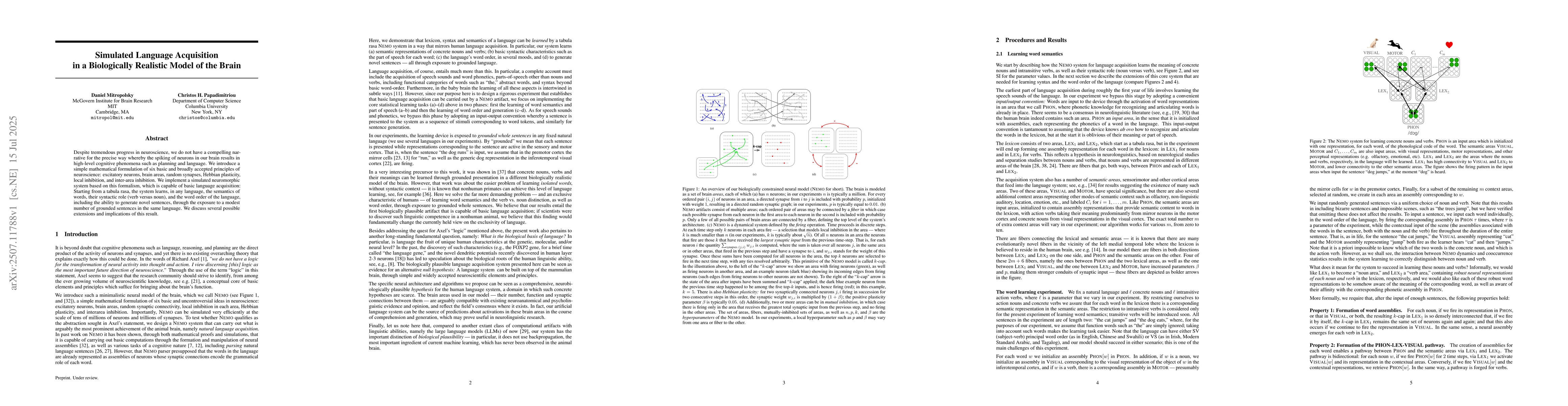 Despite tremendous progress in neuroscience, we do not have a compelling narrative for the precise way whereby the spiking of neurons in our brain results in high-level cognitive phenomena such as planning and language. We introduce a simple mathematical formulation of six basic and broadly accepted principles of neuroscience: excitatory neurons, brain areas, random synapses, Hebbian plasticity, local inhibition, and inter-area inhibition. We implement a simulated neuromorphic system based on this formalism, which is capable of basic language acquisition: Starting from a tabula rasa, the system learns, in any language, the semantics of words, their syntactic role (verb versus noun), and the word order of the language, including the ability to generate novel sentences, through the exposure to a modest number of grounded sentences in the same language. We discuss several possible extensions and implications of this result.