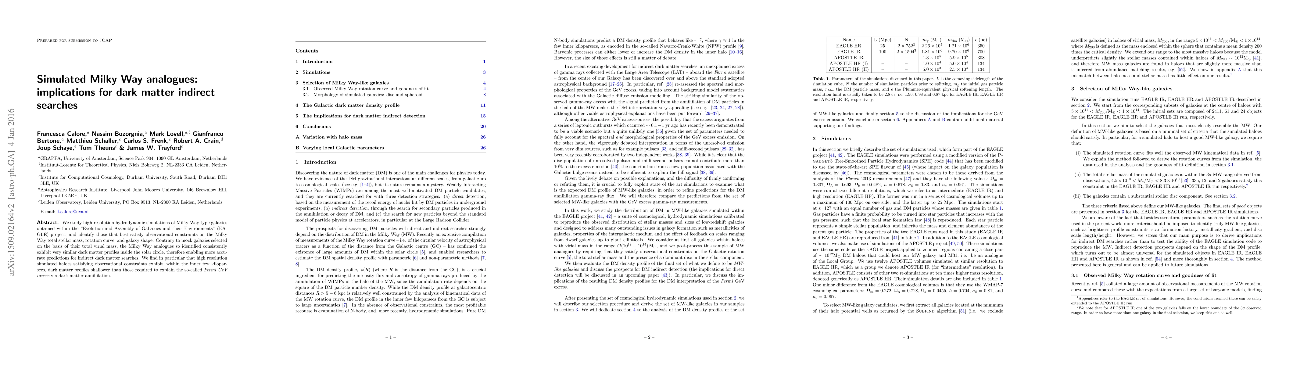 We study high-resolution hydrodynamic simulations of Milky Way type galaxies obtained within the "Evolution and Assembly of GaLaxies and their Environments" (EAGLE) project, and identify the those that best satisfy observational constraints on the Milky Way total stellar mass, rotation curve, and galaxy shape. Contrary to mock galaxies selected on the basis of their total virial mass, the Milky Way analogues so identified consistently exhibit very similar dark matter profiles inside the solar circle, therefore enabling more accurate predictions for indirect dark matter searches. We find in particular that high resolution simulated haloes satisfying observational constraints exhibit, within the inner few kiloparsecs, dark matter profiles shallower than those required to explain the so-called Fermi GeV excess via dark matter annihilation.