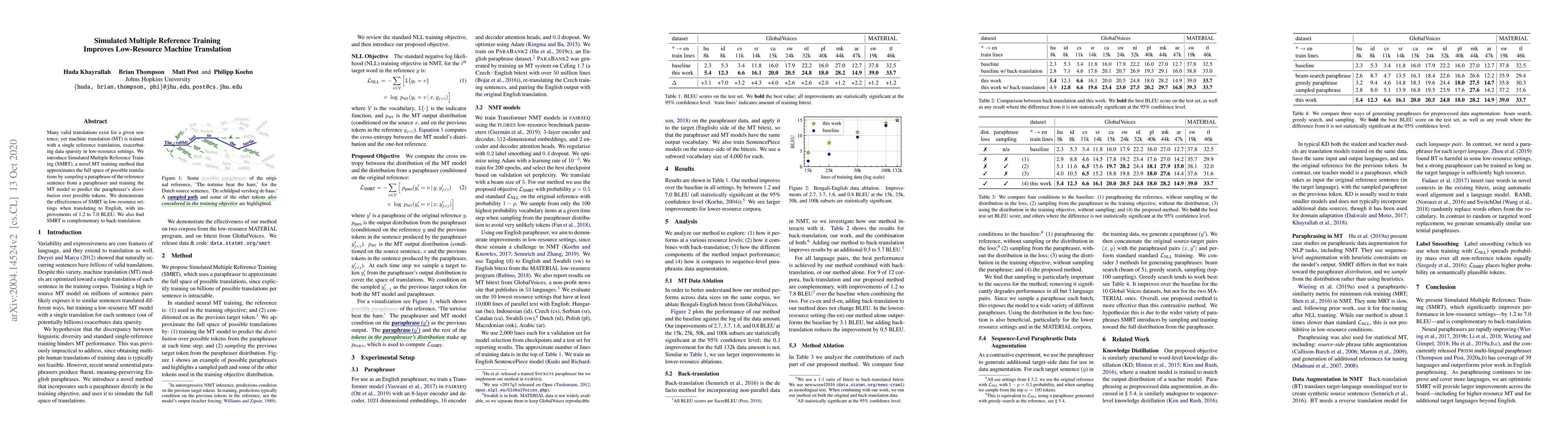 Simulated Multiple Reference Training (SMRT) enhances low-resource machine translation by approximating the full spectrum of possible translations, leading to significant improvements in BLEU scores ranging from 1.2 to 7.0. This method complements back-translation, further boosting translation quality.