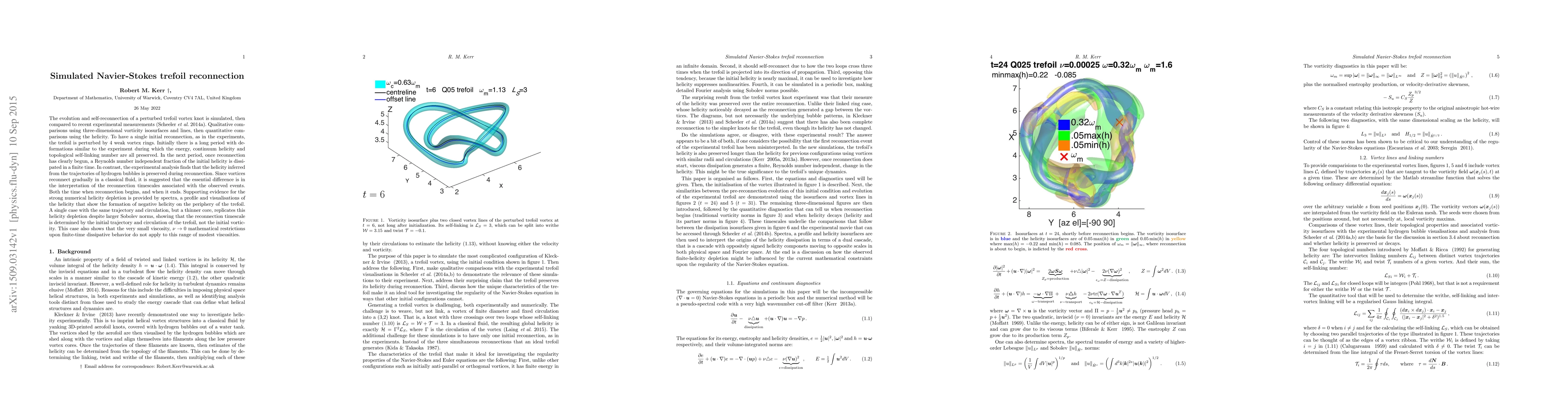 The evolution and self-reconnection of a perturbed trefoil vortex knot is simulated, then compared to recent experimental measurements (Scheeler et al. 2014a). Qualitative comparisons using three-dimensional vorticity isosurfaces and lines, then quantitative comparisons using the helicity. To have a single initial reconnection, as in the experiments, the trefoil is perturbed by 4 weak vortex rings. Initially there is a long period with deformations similar to the experiment during which the energy, continuum helicity and topological self-linking number are all preserved. In the next period, once reconnection has clearly begun, a Reynolds number independent fraction of the initial helicity is dissipated in a finite time. In contrast, the experimental analysis finds that the helicity inferred from the trajectories of hydrogen bubbles is preserved during reconnection. Since vortices reconnect gradually in a classical fluid, it is suggested that the essential difference is in the interpretation of the reconnection timescales associated with the observed events. Both the time when reconnection begins, and when it ends. Supporting evidence for the strong numerical helicity depletion is provided by spectra, a profile and visualisations of the helicity that show the formation of negative helicity on the periphery of the trefoil. A single case with the same trajectory and circulation, but a thinner core, replicates this helicity depletion despite larger Sobolev norms, showing that the reconnection timescale is determined by the initial trajectory and circulation of the trefoil, not the initial vorticity. This case also shows that the very small viscosity, $\nu\rightarrow 0$ mathematical restrictions upon finite-time dissipative behavior do not apply to this range of modest viscosities.