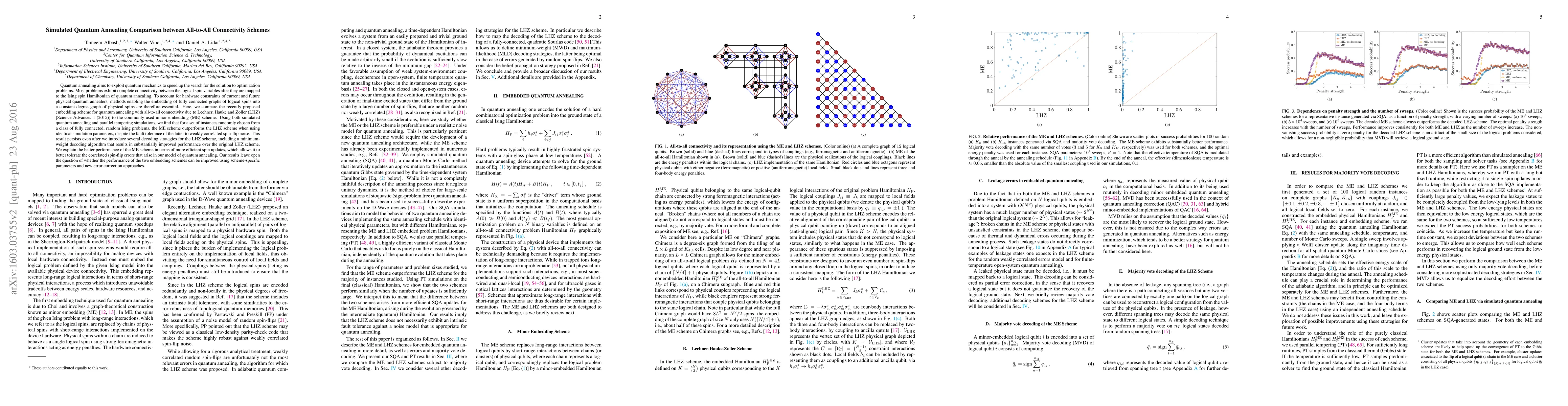 This paper compares the performance of two quantum annealing embedding schemes: minor embedding (ME) and the Lechner, Hauke, and Zoller (LHZ) scheme. Simulated quantum annealing and parallel tempering simulations show that ME outperforms LHZ for fully connected random Ising problems, despite LHZ's fault tolerance to noise. The better performance of ME is attributed to more efficient spin updates.
