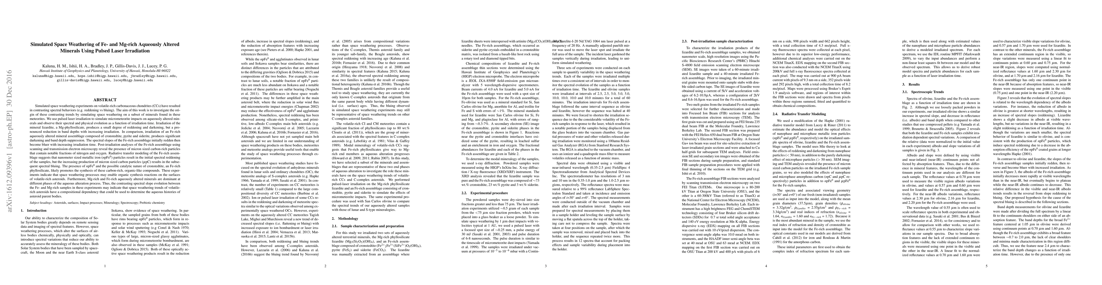 The aim of this work is to investigate contrasting spectral trends observed in carbonaceous chondrites by simulating space weathering effects on a subset of minerals found in these meteorites. We use pulsed laser irradiation to simulate micrometeorite impacts on aqueously altered minerals and observe their spectral and physical evolution as a function of irradiation time. Irradiation of the mineral lizardite, a Mg-phyllosilicate, produces little reddening and darkening, but a pronounced reduction in band depths. Irradiation of an Fe-rich aqueously altered mineral assemblage composed of cronstedtite, pyrite and siderite, produces significant darkening and band depth suppression. The spectral slopes of the Fe-rich assemblage initially redden then become bluer with increasing irradiation time. Analyses of the Fe-rich assemblage using scanning and transmission electron microscopy reveal the presence of micron sized carbon-rich particles that contain notable fractions of nitrogen and oxygen. Radiative transfer modeling of the Fe-rich assemblage suggests that npFe0 particles result in the initial spectral reddening of the samples, but the increasing production of micron sized carbon particles results in the subsequent spectral bluing. The presence of npFe0 and possibly cronstedtite likely promotes the synthesis of these organic-like compounds. These experiments indicate that space weathering processes may enable organic synthesis reactions on the surfaces of volatile-rich asteroids. Furthermore, Mg- and Fe-rich aqueously altered minerals are dominant at different phases of the alteration process. Thus, the contrasting spectral slope evolution between the Fe- and Mg-rich samples in these experiments may indicate that space weathering trends of volatile-rich asteroids have a compositional dependency that could be used to determine the aqueous histories of asteroid parent bodies.