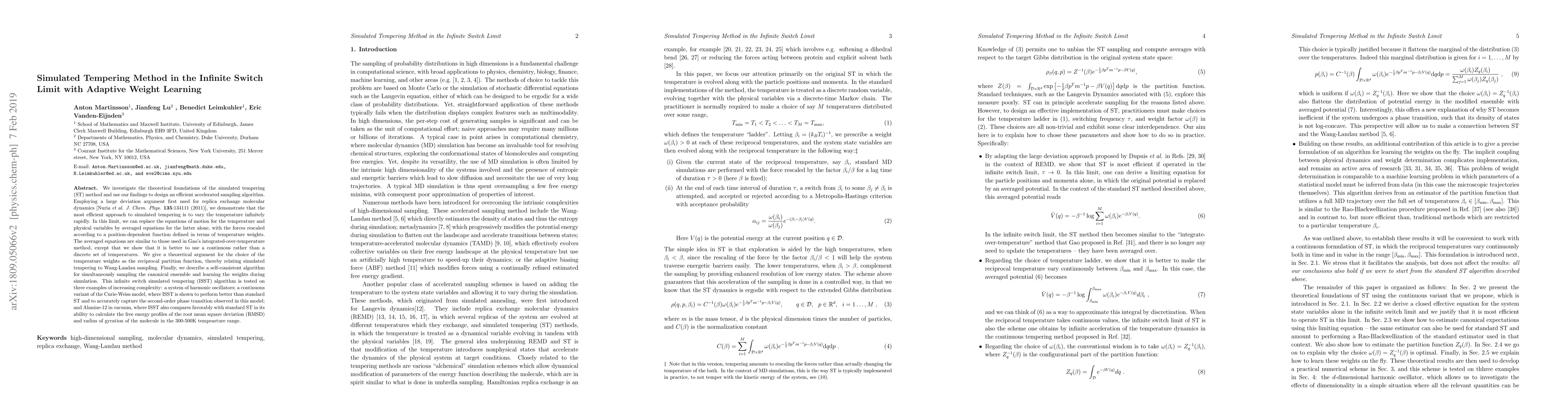 This paper explores the theoretical underpinnings of the simulated tempering method and proposes an adaptive weight learning algorithm. It finds that the most efficient simulated tempering occurs with infinite temperature variation, leading to averaged equations for physical variables and a continuous set of temperatures, which improves upon existing methods.