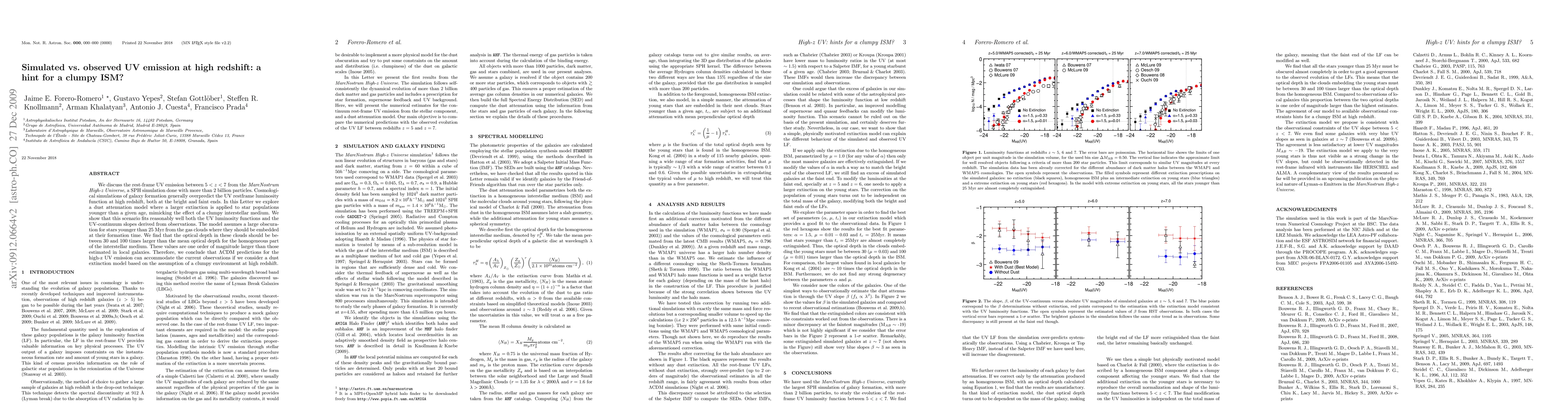 We discuss the rest-frame UV emission between 5< z < 7 from the MareNostrum High-z Universe, a SPH simulation done with more than 2 billion particles. Cosmological simulations of galaxy formation generally overpredict the UV restframe luminosity function at high redshift, both at the bright and faint ends. In this Letter we explore a dust attenuation model where a larger extinction is applied to star populations younger than a given age, mimicking the effect of a clumpy interstellar medium. We show that this scenario fits reasonably well both the UV luminosity functions and the UV-continuum slopes derived from observations. The model assumes a large obscuration for stars younger than 25 Myr from the gas clouds where they should be embedded at their formation time. We find that the optical depth in these clouds should be between 30 and 100 times larger than the mean optical depth for the homogeneous part of the interstellar medium. These values are one order of magnitude larger than those estimated in local galaxies. Therefore, we conclude that LambdaCDM predictions for the high-z UV emission can accommodate the current observations if we consider a dust extinction model based on the assumption of a clumpy environment at high redshift.