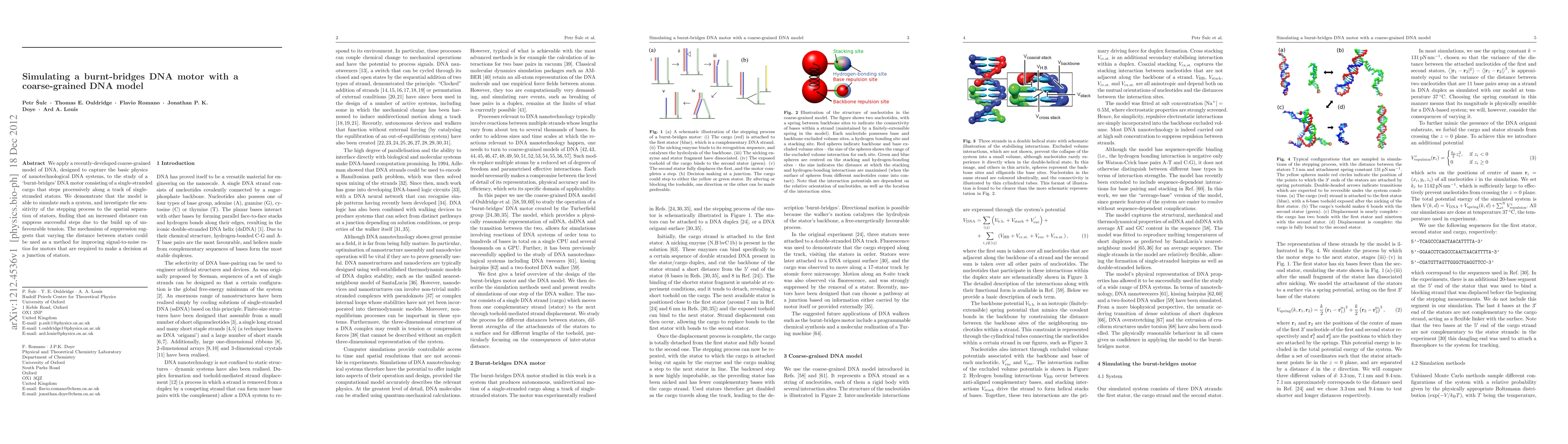 We apply a recently-developed coarse-grained model of DNA, designed to capture the basic physics of nanotechnological DNA systems, to the study of a `burnt-bridges' DNA motor consisting of a single-stranded cargo that steps processively along a track of single-stranded stators. We demonstrate that the model is able to simulate such a system, and investigate the sensitivity of the stepping process to the spatial separation of stators, finding that an increased distance can suppress successful steps due to the build up of unfavourable tension. The mechanism of suppression suggests that varying the distance between stators could be used as a method for improving signal-to-noise ratios for motors that are required to make a decision at a junction of stators.