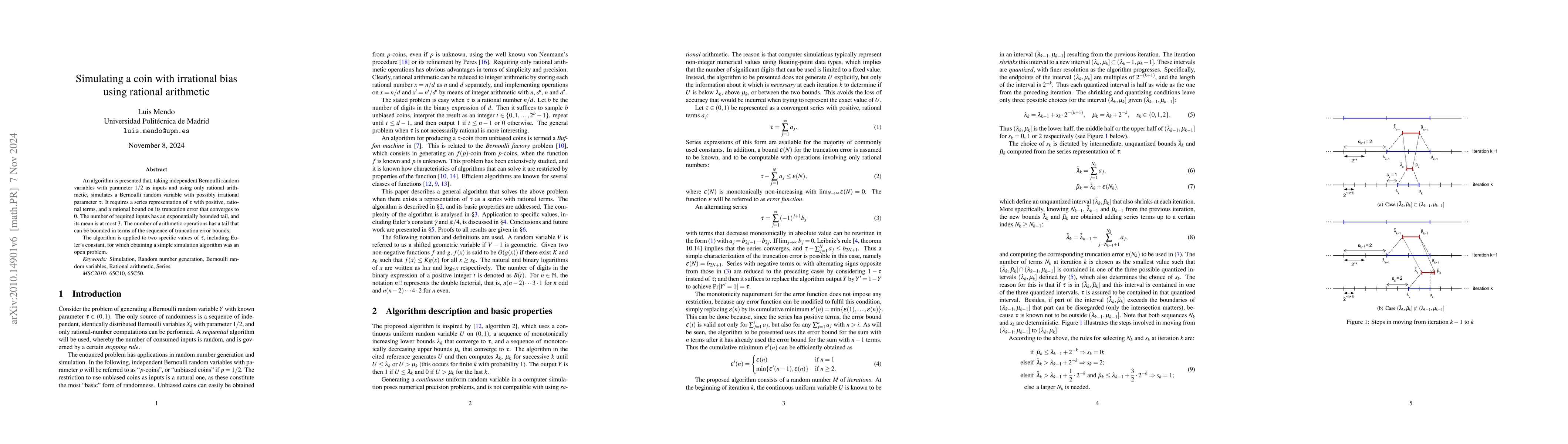 An algorithm is presented that, taking a sequence of independent Bernoulli random variables with parameter $1/2$ as inputs and using only rational arithmetic, simulates a Bernoulli random variable with possibly irrational parameter $\tau$. It requires a series representation of $\tau$ with positive, rational terms, and a rational bound on its truncation error that converges to $0$. The number of required inputs has an exponentially bounded tail, and its mean is at most $3$. The number of arithmetic operations has a tail that can be bounded in terms of the sequence of truncation error bounds. The algorithm is applied to two specific values of $\tau$, including Euler's constant, for which obtaining a simple simulation algorithm was an open problem.