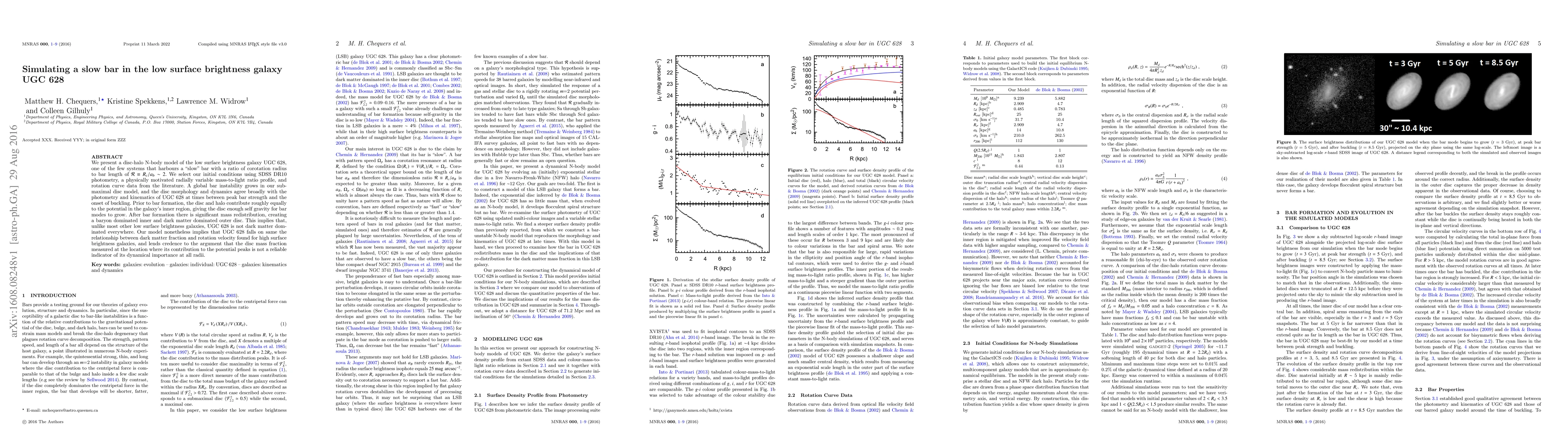 We present a disc-halo N-body model of the low surface brightness galaxy UGC 628, one of the few systems that harbours a "slow" bar with a ratio of corotation radius to bar length of $\mathcal{R} \equiv R_c/a_b \sim 2$. We select our initial conditions using SDSS DR10 photometry, a physically motivated radially variable mass-to-light ratio profile, and rotation curve data from the literature. A global bar instability grows in our submaximal disc model, and the disc morphology and dynamics agree broadly with the photometry and kinematics of UGC 628 at times between peak bar strength and the onset of buckling. Prior to bar formation, the disc and halo contribute roughly equally to the potential in the galaxy's inner region, giving the disc enough self gravity for bar modes to grow. After bar formation there is significant mass redistribution, creating a baryon dominated inner and dark matter dominated outer disc. This implies that, unlike most other low surface brightness galaxies, UGC 628 is not dark matter dominated everywhere. Our model nonetheless implies that UGC 628 falls on same the relationship between dark matter fraction and rotation velocity found for high surface brightness galaxies, and lends credence to the argument that the disc mass fraction measured at the location where its contribution to the potential peaks is not a reliable indicator of its dynamical importance at all radii.