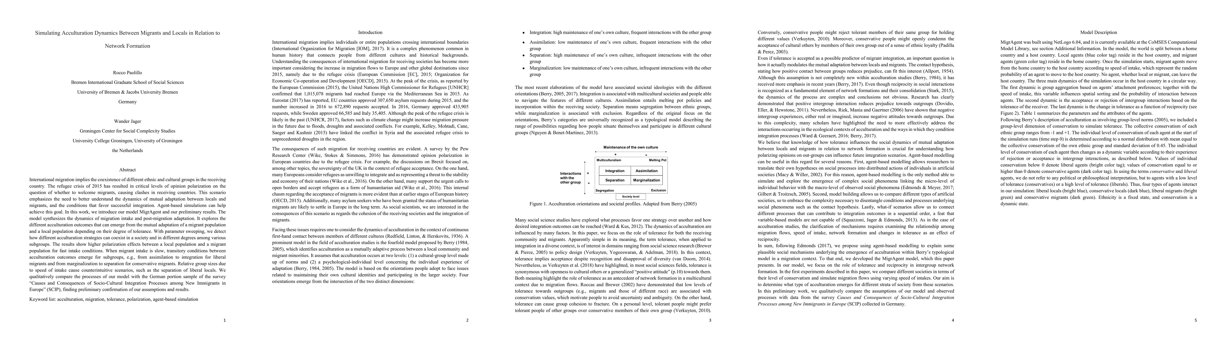 This paper introduces MigrAgent, an agent-based simulation model to study acculturation dynamics between migrants and locals, focusing on network formation and adaptation strategies. The model reveals that fast migrant intake heightens polarization, while slow intake leads to varied acculturation outcomes, such as assimilation or separation, depending on tolerance levels.