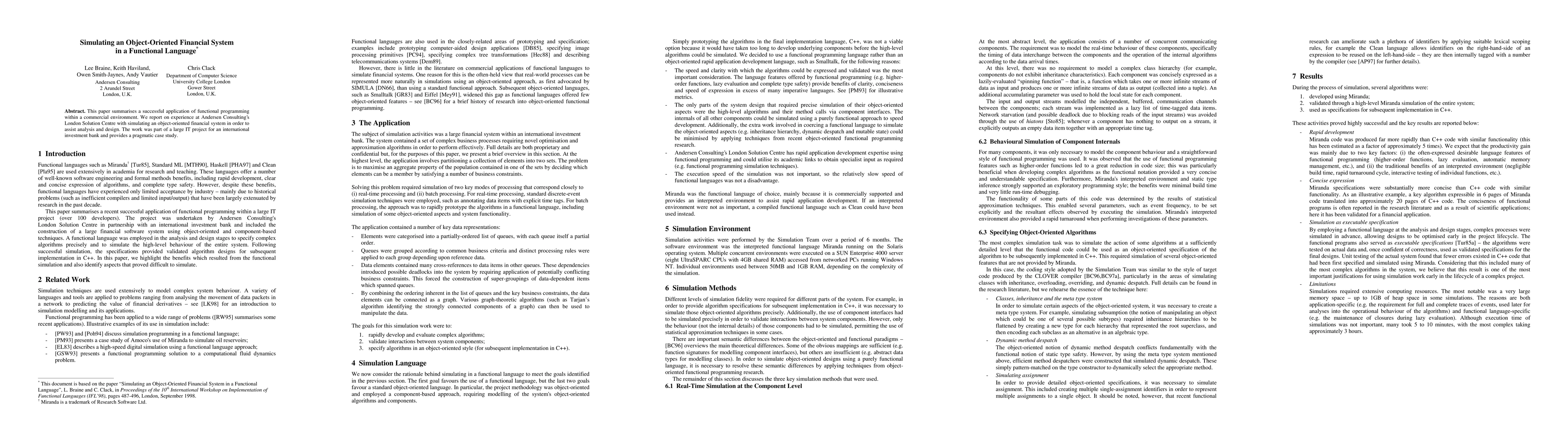 This paper summarises a successful application of functional programming within a commercial environment. We report on experience at Accenture's Financial Services Solution Centre in London with simulating an object-oriented financial system in order to assist analysis and design. The work was part of a large IT project for an international investment bank and provides a pragmatic case study.