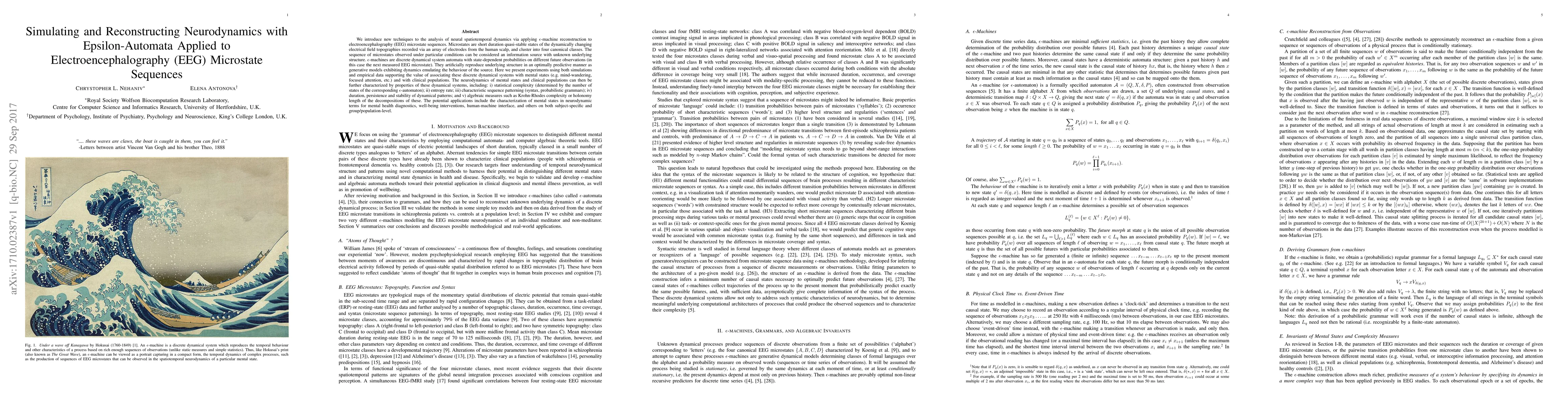 We introduce new techniques to the analysis of neural spatiotemporal dynamics via applying $\epsilon$-machine reconstruction to electroencephalography (EEG) microstate sequences. Microstates are short duration quasi-stable states of the dynamically changing electrical field topographies recorded via an array of electrodes from the human scalp, and cluster into four canonical classes. The sequence of microstates observed under particular conditions can be considered an information source with unknown underlying structure. $\epsilon$-machines are discrete dynamical system automata with state-dependent probabilities on different future observations (in this case the next measured EEG microstate). They artificially reproduce underlying structure in an optimally predictive manner as generative models exhibiting dynamics emulating the behaviour of the source. Here we present experiments using both simulations and empirical data supporting the value of associating these discrete dynamical systems with mental states (e.g. mind-wandering, focused attention, etc.) and with clinical populations. The neurodynamics of mental states and clinical populations can then be further characterized by properties of these dynamical systems, including: i) statistical complexity (determined by the number of states of the corresponding $\epsilon$-automaton); ii) entropy rate; iii) characteristic sequence patterning (syntax, probabilistic grammars); iv) duration, persistence and stability of dynamical patterns; and v) algebraic measures such as Krohn-Rhodes complexity or holonomy length of the decompositions of these. The potential applications include the characterization of mental states in neurodynamic terms for mental health diagnostics, well-being interventions, human-machine interface, and others on both subject-specific and group/population-level.