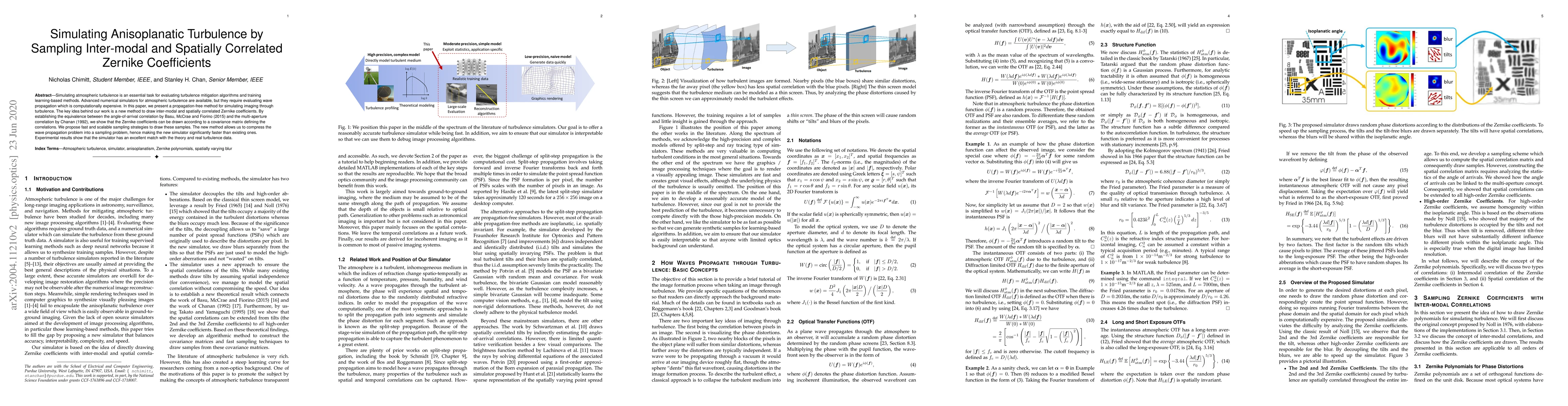This paper presents a propagation-free method for simulating atmospheric turbulence by sampling inter-modal and spatially correlated Zernike coefficients, significantly speeding up the simulation process compared to existing wave propagation methods. The method leverages the equivalence between angle-of-arrival and multi-aperture correlations to define a covariance matrix for efficient sampling, achieving a good match with theoretical and real turbulence data.