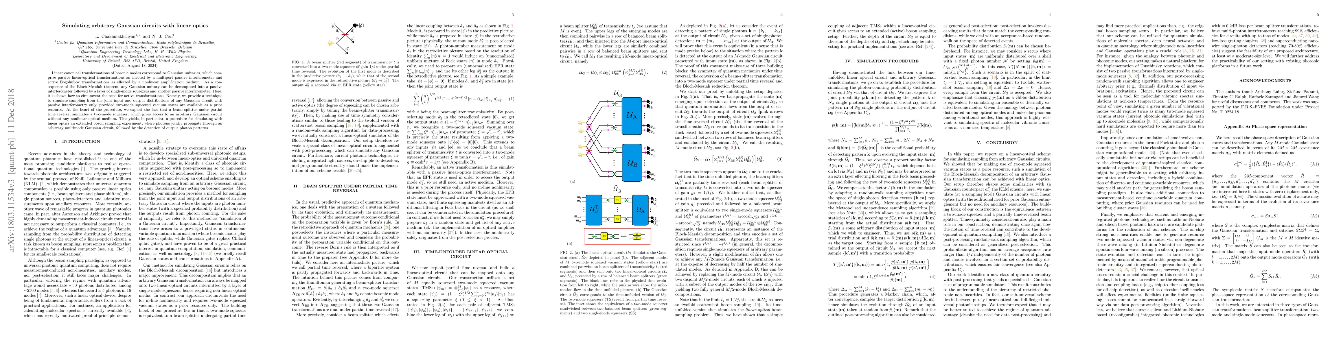 This research presents a method to simulate Gaussian circuits using only passive linear-optical components, eliminating the need for nonlinear media. It leverages the equivalence of beam splitters under partial time reversal to two-mode squeezers, enabling the simulation of any Gaussian circuit with linear optics alone, and has implications for extended boson sampling experiments.