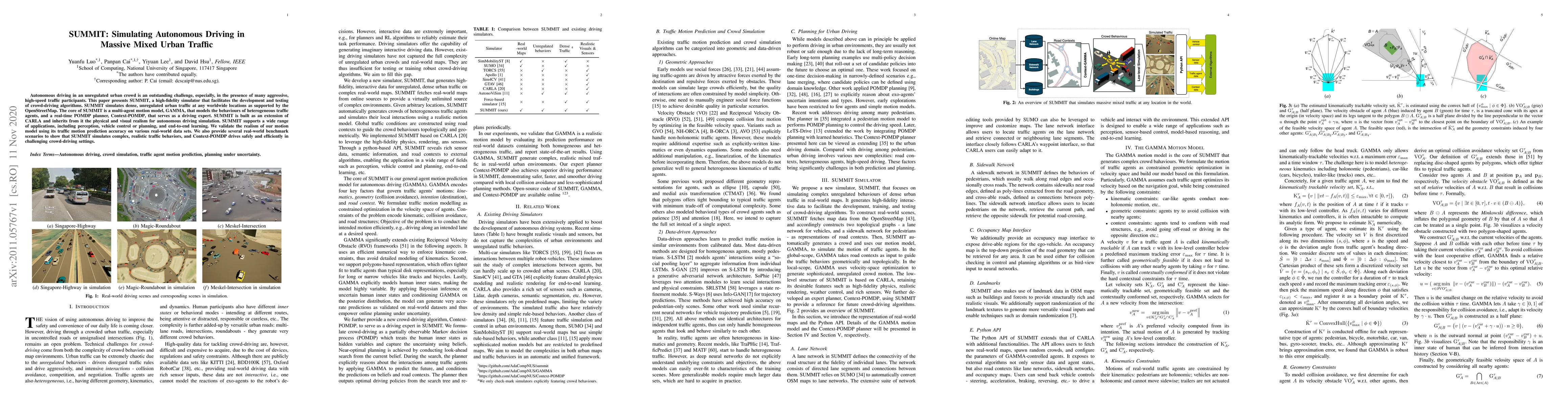Autonomous driving in an unregulated urban crowd is an outstanding challenge, especially, in the presence of many aggressive, high-speed traffic participants. This paper presents SUMMIT, a high-fidelity simulator that facilitates the development and testing of crowd-driving algorithms. SUMMIT simulates dense, unregulated urban traffic at any worldwide locations as supported by the OpenStreetMap. The core of SUMMIT is a multi-agent motion model, GAMMA, that models the behaviours of heterogeneous traffic agents, and a real-time POMDP planner, Context-POMDP, that serves as a driving expert. SUMMIT is built as an extension of CARLA and inherits from it the physical and visual realism for autonomous driving simulation. SUMMIT supports a wide range of applications, including perception, vehicle control or planning, and end-to-end learning. We validate the realism of our motion model using its traffic motion prediction accuracy on various real-world data sets. We also provide several real-world benchmark scenarios to show that SUMMIT simulates complex, realistic traffic behaviors, and Context-POMDP drives safely and efficiently in challenging crowd-driving settings.