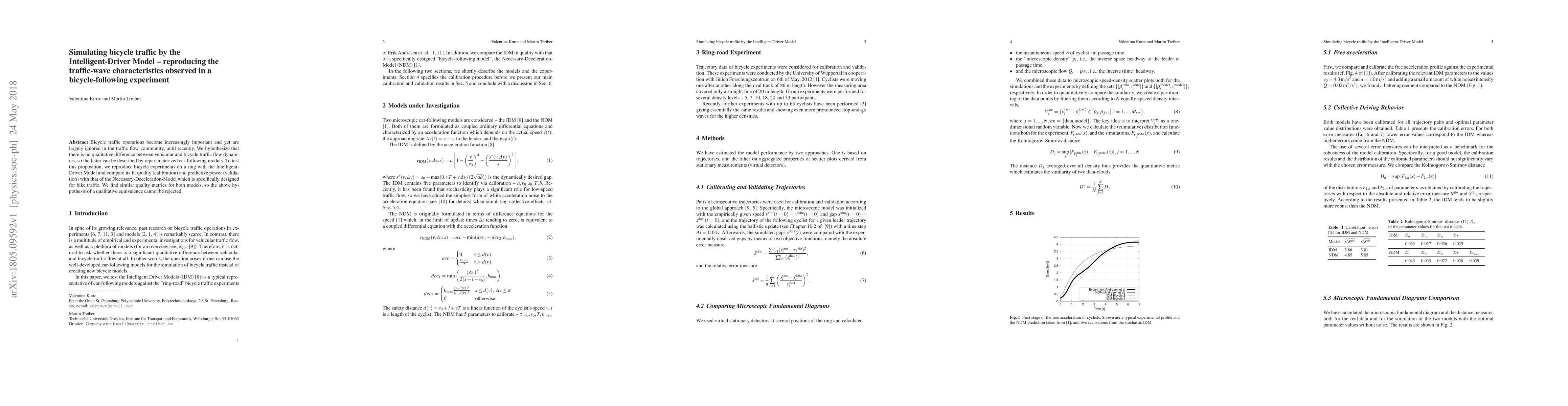 A study uses car-following models to simulate bicycle traffic, finding that bike traffic dynamics resemble those of vehicular traffic, and both models show similar quality metrics for fit and predictive power.