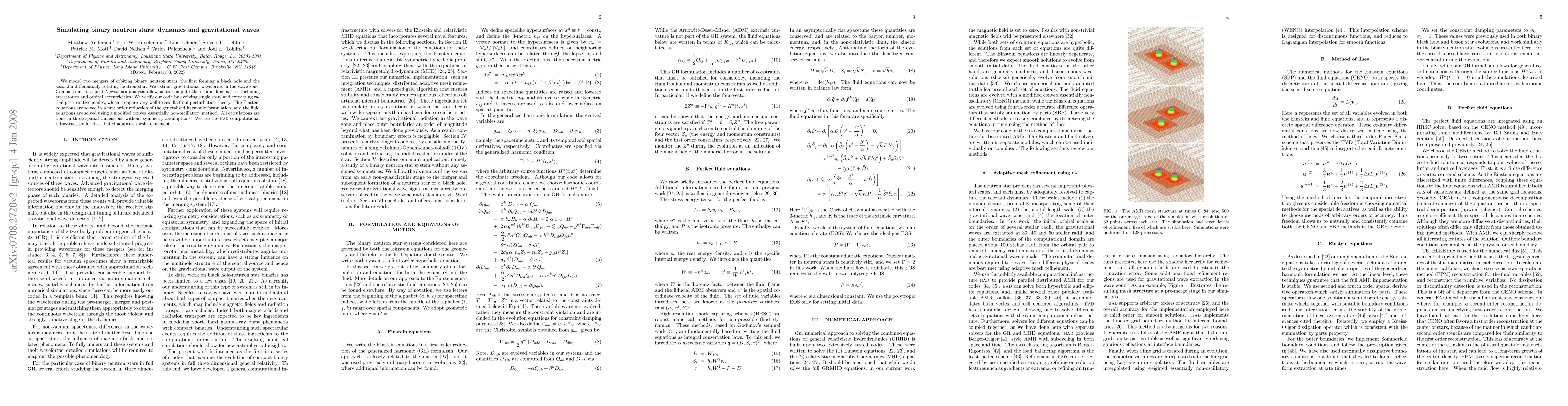 This paper models the mergers of binary neutron stars, simulating the formation of a black hole and a differentially rotating neutron star, and extracts gravitational waveforms. The study verifies the code's accuracy through comparisons to post-Newtonian analysis and perturbation theory, employing a first-order reduction of the Einstein equations and a modified numerical method for fluid dynamics.