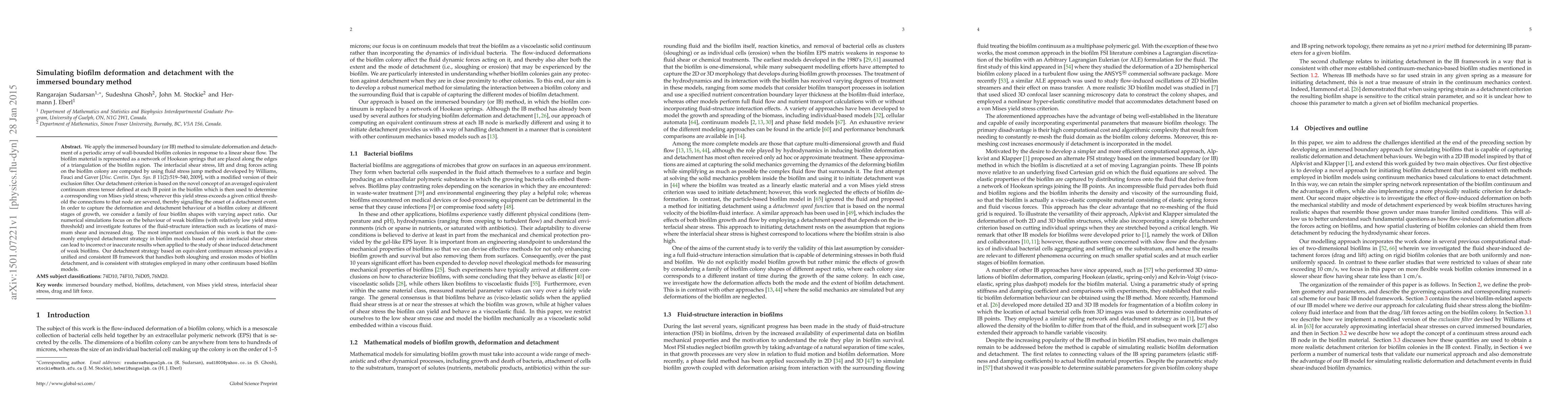 This paper applies the immersed boundary method to simulate biofilm deformation and detachment under shear flow, employing a network of Hookean springs to represent biofilm material. It introduces an improved detachment criterion based on averaged equivalent continuum stress tensors, revealing that traditional detachment strategies based solely on interfacial shear stress can be inaccurate for weak biofilms.