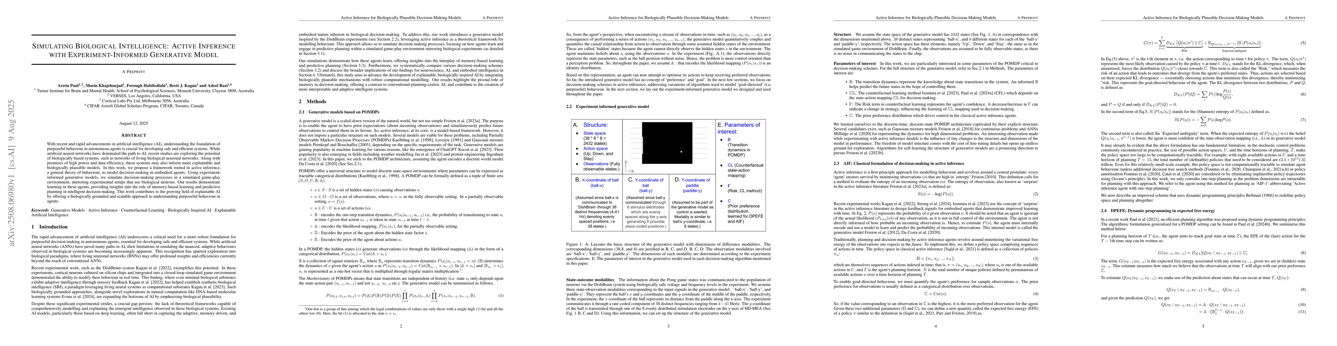 With recent and rapid advancements in artificial intelligence (AI), understanding the foundation of purposeful behaviour in autonomous agents is crucial for developing safe and efficient systems. While artificial neural networks have dominated the path to AI, recent studies are exploring the potential of biologically based systems, such as networks of living biological neuronal networks. Along with promises of high power and data efficiency, these systems may also inform more explainable and biologically plausible models. In this work, we propose a framework rooted in active inference, a general theory of behaviour, to model decision-making in embodied agents. Using experiment-informed generative models, we simulate decision-making processes in a simulated game-play environment, mirroring experimental setups that use biological neurons. Our results demonstrate learning in these agents, providing insights into the role of memory-based learning and predictive planning in intelligent decision-making. This work contributes to the growing field of explainable AI by offering a biologically grounded and scalable approach to understanding purposeful behaviour in agents.