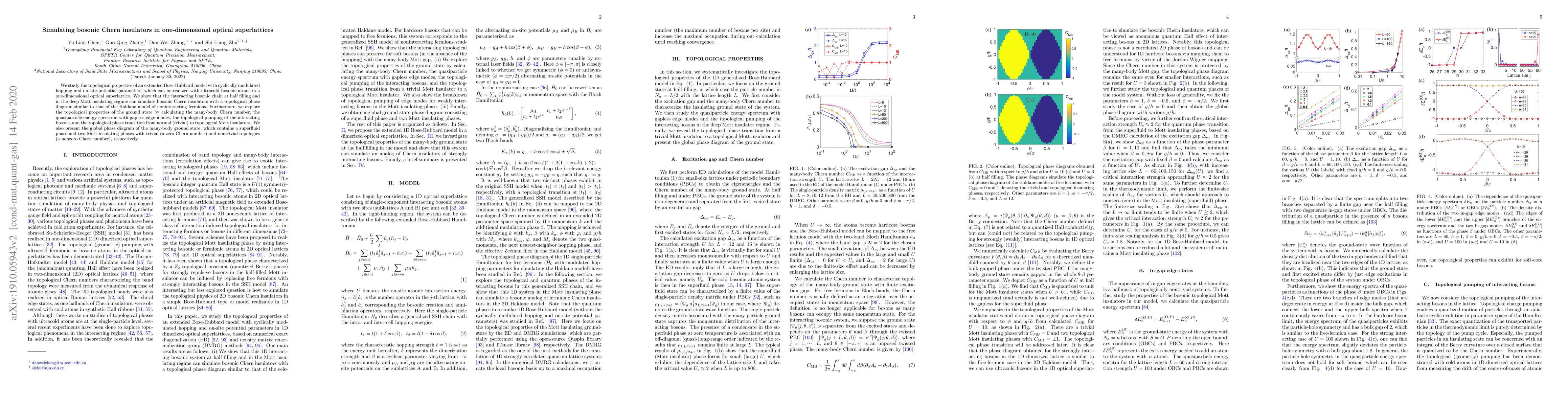We study the topological properties of an extended Bose-Hubbard model with cyclically modulated hopping and on-site potential parameters, which can be realized with ultracold bosonic atoms in a one-dimensional optical superlattice. We show that the interacting bosonic chain at half filling and in the deep Mott insulating regime can simulate bosonic Chern insulators with a topological phase diagram similar to that of the Haldane model of noninteracting fermions. Furthermore, we explore the topological properties of the ground state by calculating the many-body Chern number, the quasiparticle energy spectrum with gapless edge modes, the topological pumping of the interacting bosons, and the topological phase transition from normal (trivial) to topological Mott insulators. We also present the global phase diagram of the many-body ground state, which contains a superfluid phase and two Mott insulating phases with trivial (a zero Chern number) and nontrivial topologies (a nonzero Chern number), respectively.