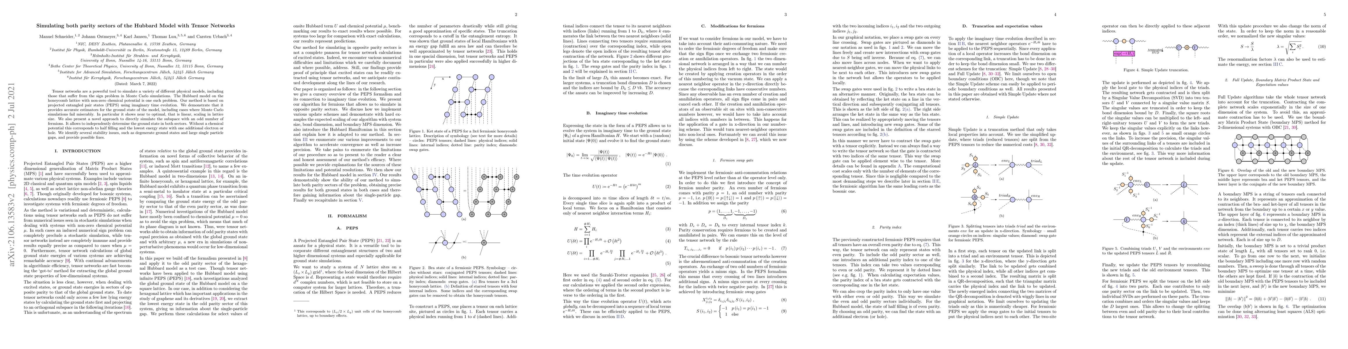 Tensor networks are a powerful tool to simulate a variety of different physical models, including those that suffer from the sign problem in Monte Carlo simulations. The Hubbard model on the honeycomb lattice with non-zero chemical potential is one such problem. Our method is based on projected entangled pair states (PEPS) using imaginary time evolution. We demonstrate that it provides accurate estimators for the ground state of the model, including cases where Monte Carlo simulations fail miserably. In particular it shows near to optimal, that is linear, scaling in lattice size. We also present a novel approach to directly simulate the subspace with an odd number of fermions. It allows to independently determine the ground state in both sectors. Without a chemical potential this corresponds to half filling and the lowest energy state with one additional electron or hole. We identify several stability issues, such as degenerate ground states and large single particle gaps, and provide possible fixes.