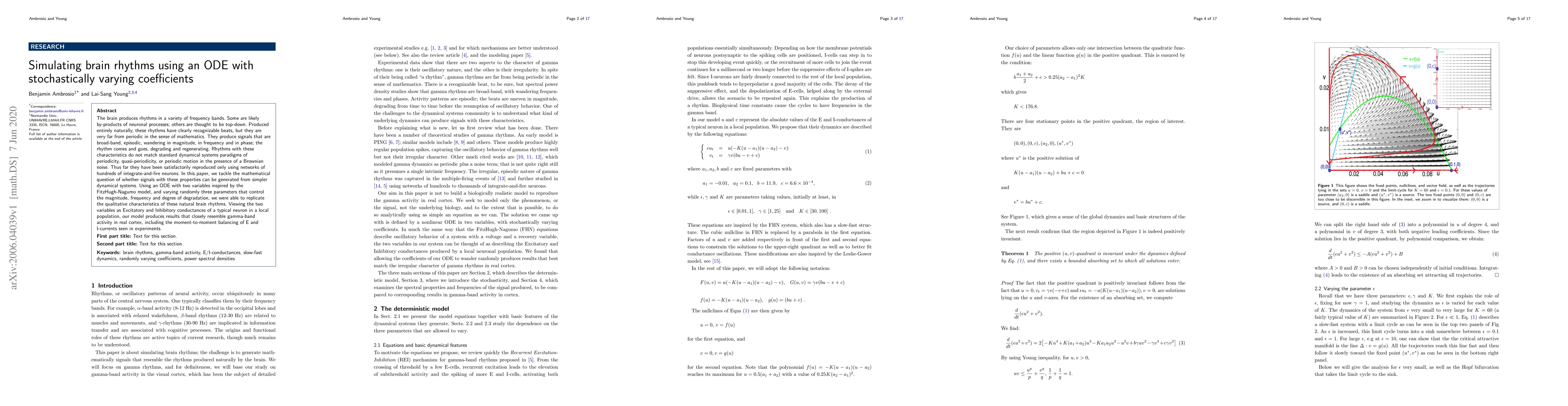 The brain produces rhythms in a variety of frequency bands. Some are likely by-products of neuronal processes; others are thought to be top-down. Produced entirely naturally, these rhythms have clearly recognizable beats, but they are very far from periodic in the sense of mathematics. They produce signals that are broad-band, episodic, wandering in magnitude, in frequency and in phase; the rhythm comes and goes, degrading and regenerating. Rhythms with these characteristics do not match standard dynamical systems paradigms of periodicity, quasi-periodicity, or periodic motion in the presence of a Brownian noise. Thus far they have been satisfactorily reproduced only using networks of hundreds of integrate-and-fire neurons. In this paper, we tackle the mathematical question of whether signals with these properties can be generated from simpler dynamical systems. Using an ODE with two variables inspired by the FitzHugh-Nagumo model, and varying randomly three parameters that control the magnitude, frequency and degree of degradation, we were able to replicate the qualitative characteristics of these natural brain rhythms. Viewing the two variables as Excitatory and Inhibitory conductances of a typical neuron in a local population, our model produces results that closely resemble gamma-band activity in real cortex, including the moment-to-moment balancing of E and I-currents seen in experiments.