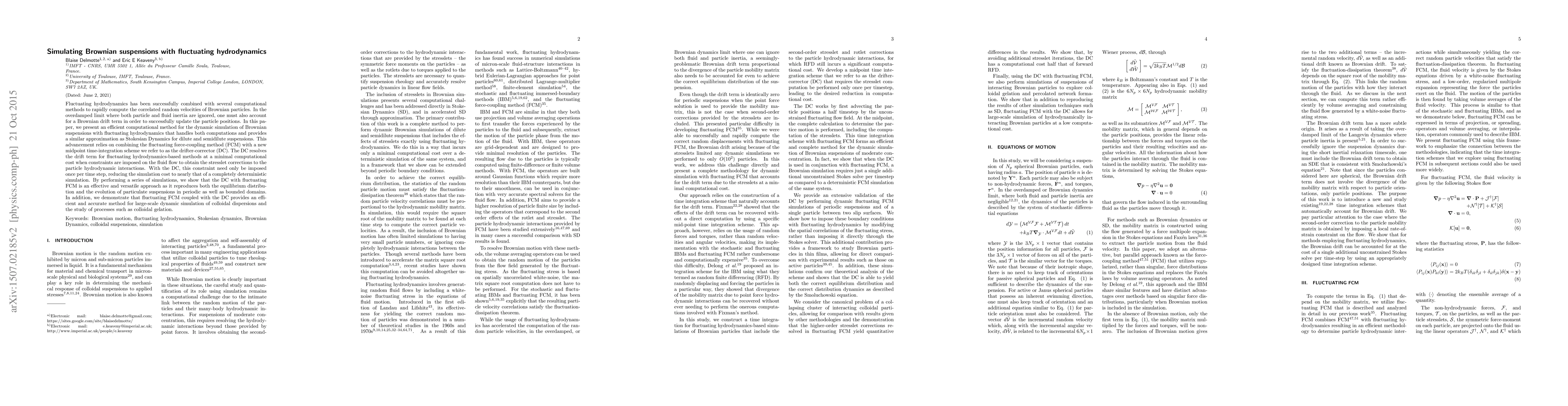 This paper introduces an efficient computational method combining fluctuating hydrodynamics with a new midpoint time-integration scheme called drifter-corrector (DC) to simulate Brownian suspensions. The DC method significantly reduces computational cost while maintaining accuracy, enabling effective large-scale dynamic simulations of colloidal dispersions.