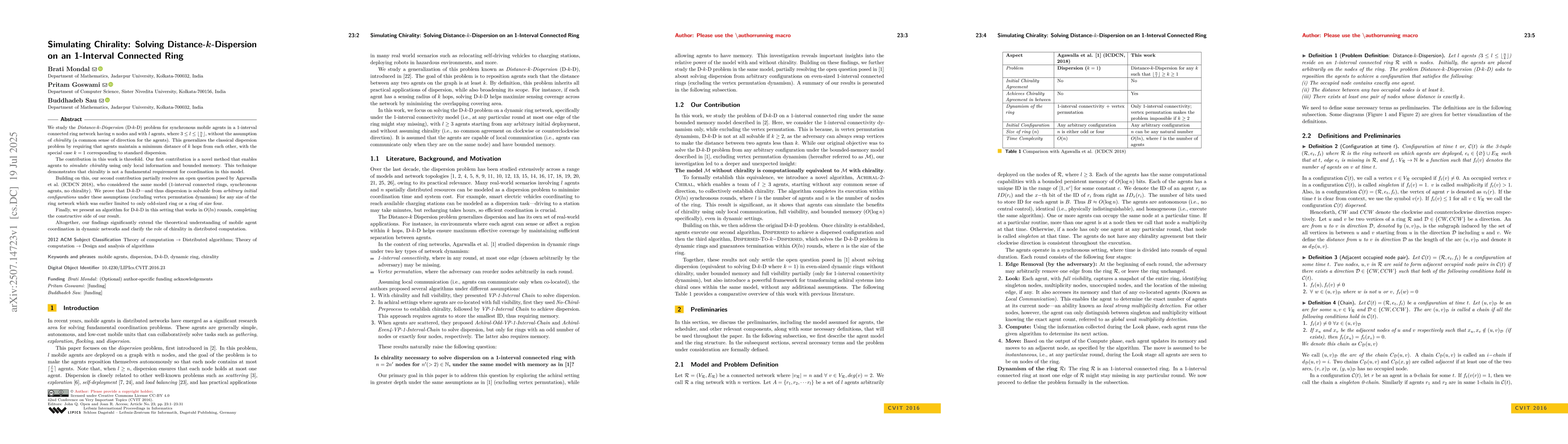 We study the Distance-$k$-Dispersion (D-$k$-D) problem for synchronous mobile agents in a 1-interval-connected ring network having $n$ nodes and with $l$ agents where $3 \le l \le \lfloor \frac{n}{k}\rfloor$, without the assumption of chirality (a common sense of direction for the agents). This generalizes the classical dispersion problem by requiring that agents maintain a minimum distance of $k$ hops from each other, with the special case $k=1$ corresponding to the standard dispersion. The contribution in this work is threefold. Our first contribution is a novel method that enables agents to simulate chirality using only local information, vision and bounded memory. This technique demonstrates that chirality is not a fundamental requirement for coordination in this model. Building on this, our second contribution partially resolves an open question posed by Agarwalla et al. (ICDCN, 2018), who considered the same model (1- interval connected ring, synchronous agents, no chirality). We prove that D-$k$-D, and thus dispersion is solvable from any arbitrary configuration under these assumptions (excluding vertex permutation dynamism)for any size of the ring network which was earlier limited to only odd sized ring or to a ring of size four. Finally, we present an algorithm for D-$k$-D in this setting that works in $O(ln)$ rounds, completing the constructive side of our result. Altogether, our findings significantly extend the theoretical understanding of mobile agent coordination in dynamic networks and clarify the role of chirality in distributed computation.