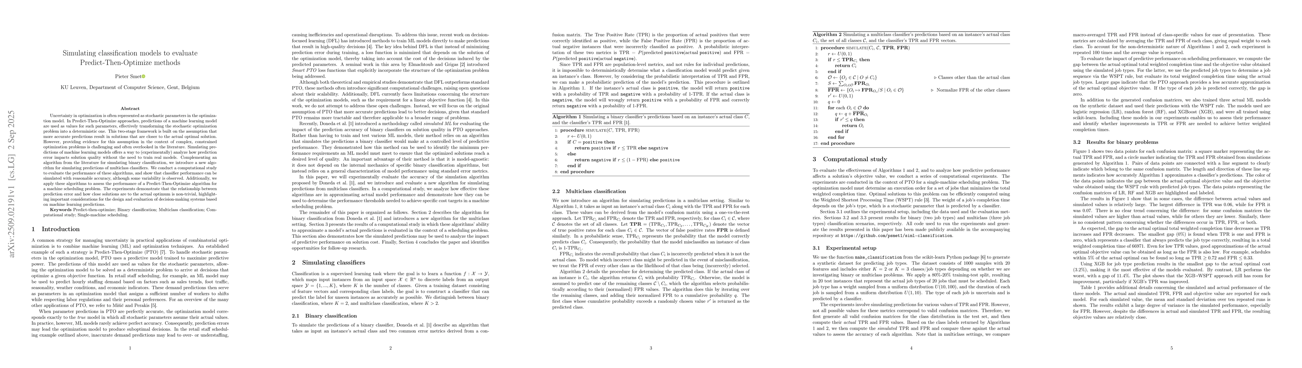 Uncertainty in optimization is often represented as stochastic parameters in the optimization model. In Predict-Then-Optimize approaches, predictions of a machine learning model are used as values for such parameters, effectively transforming the stochastic optimization problem into a deterministic one. This two-stage framework is built on the assumption that more accurate predictions result in solutions that are closer to the actual optimal solution. However, providing evidence for this assumption in the context of complex, constrained optimization problems is challenging and often overlooked in the literature. Simulating predictions of machine learning models offers a way to (experimentally) analyze how prediction error impacts solution quality without the need to train real models. Complementing an algorithm from the literature for simulating binary classification, we introduce a new algorithm for simulating predictions of multiclass classifiers. We conduct a computational study to evaluate the performance of these algorithms, and show that classifier performance can be simulated with reasonable accuracy, although some variability is observed. Additionally, we apply these algorithms to assess the performance of a Predict-Then-Optimize algorithm for a machine scheduling problem. The experiments demonstrate that the relationship between prediction error and how close solutions are to the actual optimum is non-trivial, highlighting important considerations for the design and evaluation of decision-making systems based on machine learning predictions.