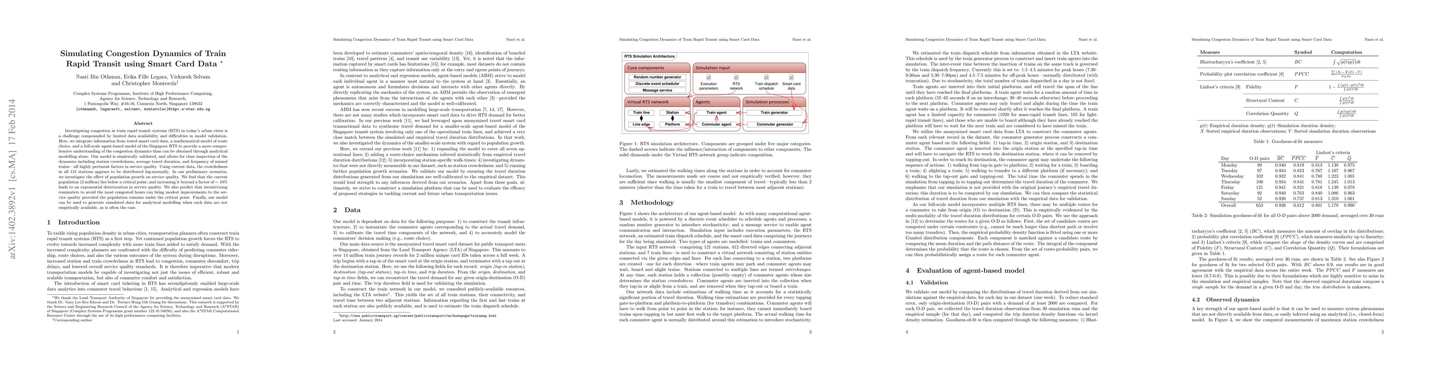 This paper simulates congestion dynamics in Singapore's rapid transit system using smart card data, a mathematical model, and an agent-based model. It finds that a 10% increase in population leads to exponential service quality decline, while avoiding peak congestion hours can modestly improve service quality if population growth is controlled.