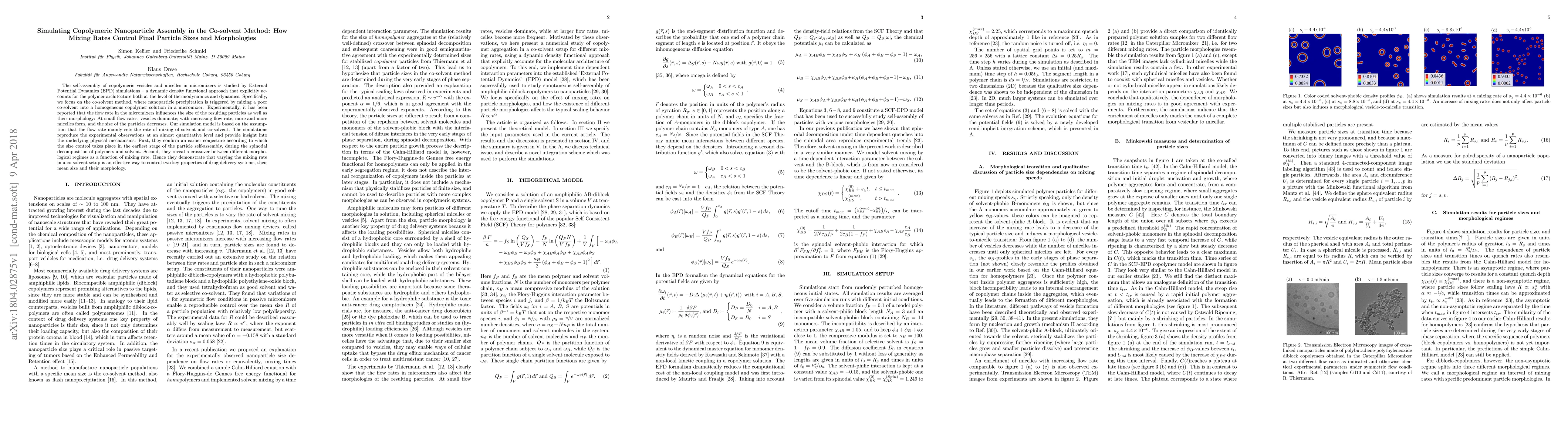 This paper uses External Potential Dynamics (EPD) simulations to study the self-assembly of copolymeric nanoparticles in a co-solvent method, focusing on how mixing rates influence particle size and morphology. The simulations confirm that lower flow rates favor vesicle formation while higher rates promote micelle formation, providing insights into the underlying physical mechanisms.