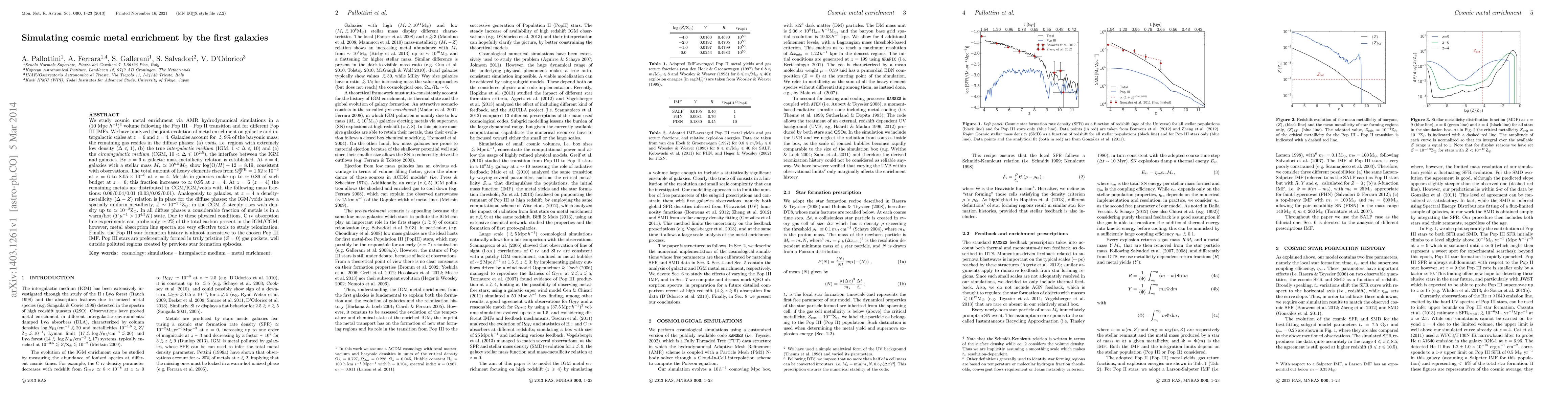 This paper investigates cosmic metal enrichment through adaptive mesh refinement hydrodynamical simulations, focusing on the transition from Pop III to Pop II galaxies. By z=6, a galactic mass-metallicity relation is established, and by z=4, galaxies with stellar mass $M_*=10^{8.5}M_\odot$ show consistent metallicity with observations. The study highlights the distribution of metals across galaxies, the circumgalactic medium, the intergalactic medium, and voids, emphasizing the role of metal absorption lines in studying reionization.