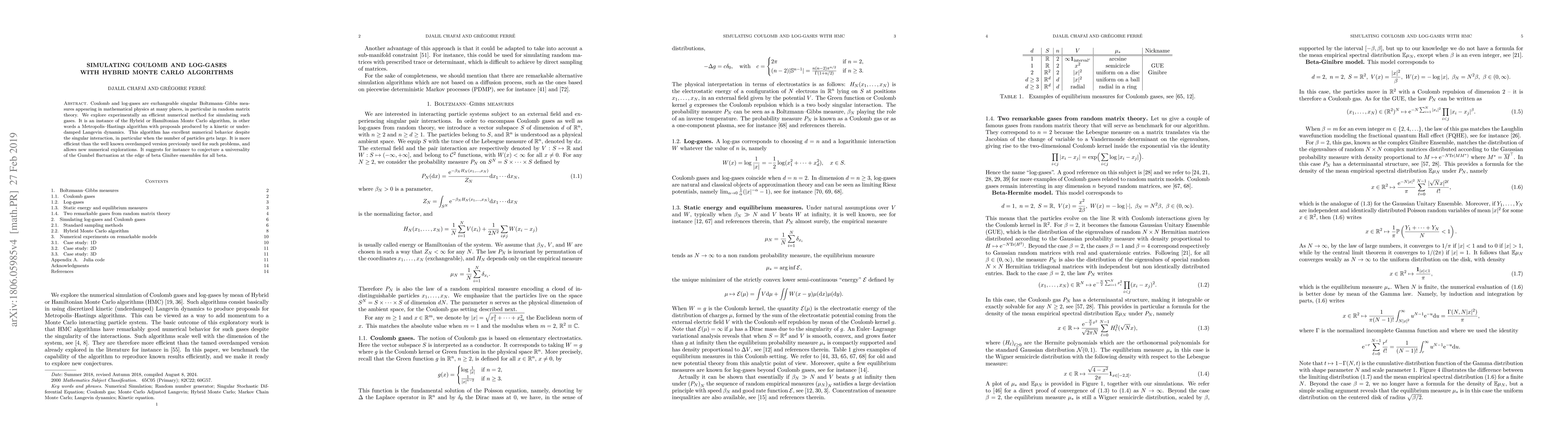 This paper investigates the use of Hybrid Monte Carlo algorithms to efficiently simulate Coulomb and log-gases, which are significant in mathematical physics, particularly in random matrix theory. The proposed method, based on kinetic or underdamped Langevin dynamics, outperforms the traditional overdamped version and suggests a universality of Gumbel fluctuations in beta Ginibre ensembles.