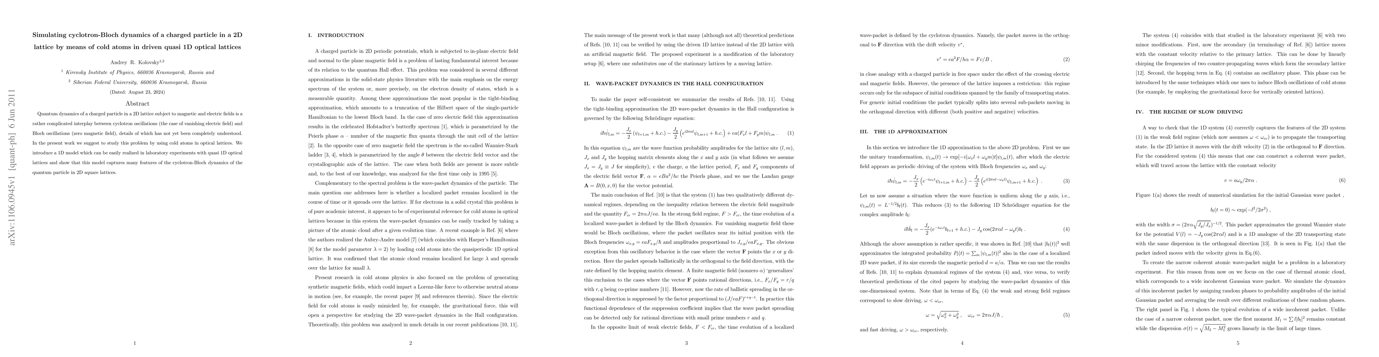 This paper proposes using cold atoms in quasi 1D optical lattices to simulate the cyclotron-Bloch dynamics of a charged particle in a 2D lattice under magnetic and electric fields. The study introduces a simplified 1D model that effectively captures key features of the complex quantum dynamics in 2D square lattices.