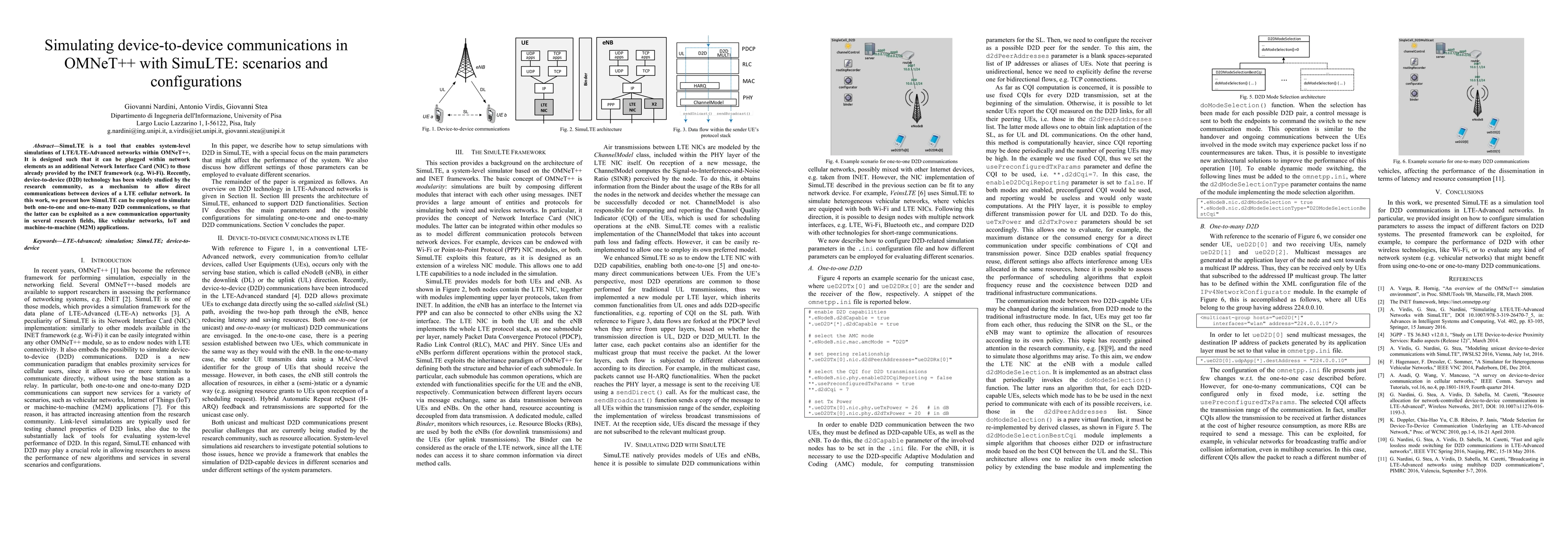 SimuLTE is a tool that enables system-level simulations of LTE/LTE-Advanced networks within OMNeT++. It is designed such that it can be plugged within network elements as an additional Network Interface Card (NIC) to those already provided by the INET framework (e.g. Wi-Fi). Recently, device-to-device (D2D) technology has been widely studied by the research community, as a mechanism to allow direct communications between devices of a LTE cellular network. In this work, we present how SimuLTE can be employed to simulate both one-to-one and one-to-many D2D communications, so that the latter can be exploited as a new communication opportunity in several research fields, like vehicular networks, IoT and machine-to-machine (M2M) applications.