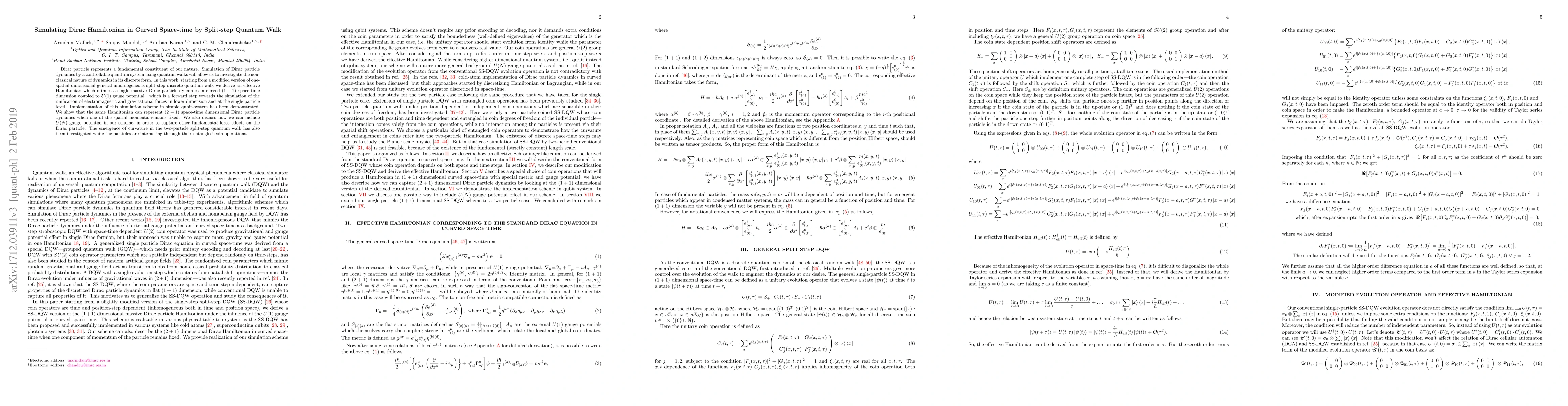 Dirac particle represents a fundamental constituent of our nature. Simulation of Dirac particle dynamics by a controllable quantum system using quantum walks will allow us to investigate the non-classical nature of dynamics in its discrete form. In this work, starting from a modified version of one-spatial dimensional general inhomogeneous split-step discrete quantum walk we derive an effective Hamiltonian which mimics a single massive Dirac particle dynamics in curved $(1+1)$ space-time dimension coupled to $U(1)$ gauge potential---which is a forward step towards the simulation of the unification of electromagnetic and gravitational forces in lower dimension and at the single particle level. Implementation of this simulation scheme in simple qubit-system has been demonstrated. We show that the same Hamiltonian can represent $(2+1)$ space-time dimensional Dirac particle dynamics when one of the spatial momenta remains fixed. We also discuss how we can include $U(N)$ gauge potential in our scheme, in order to capture other fundamental force effects on the Dirac particle. The emergence of curvature in the two-particle split-step quantum walk has also been investigated while the particles are interacting through their entangled coin operations.